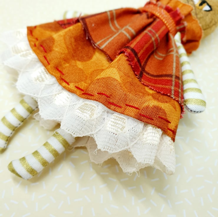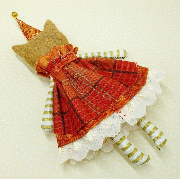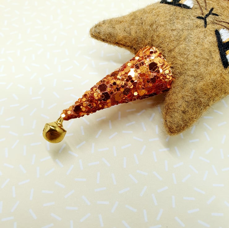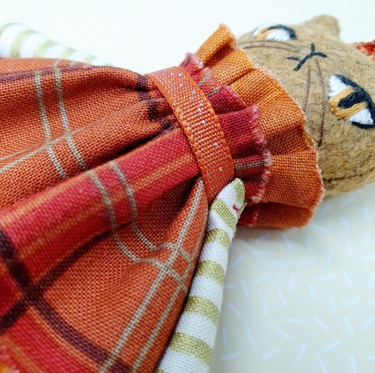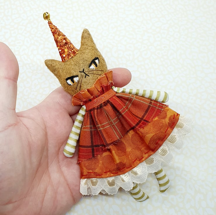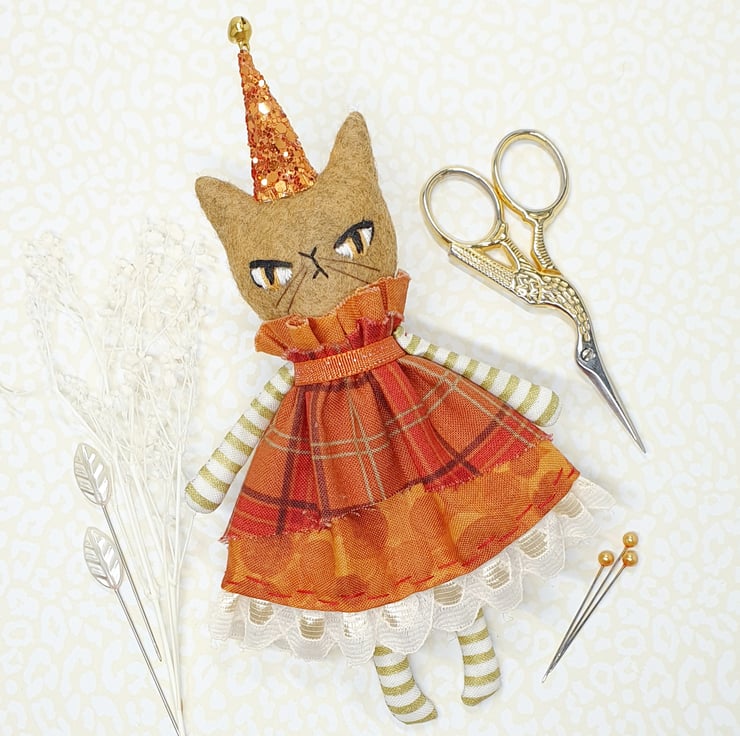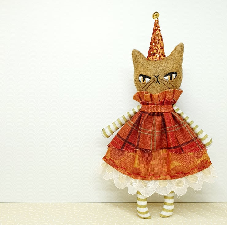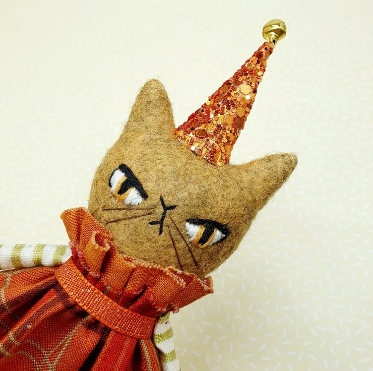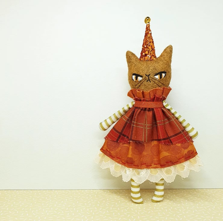 Decorative textile art doll with felt body and hand embroidered face. Edith wears a hand stitched shiny party hat topped with a bell. This kitty wears a layered dress with beaded trim across the top and ruffled lace around the neck. Kitty measures roughly 17cm tall and can only stand if leaning against something. This is for decorative purposes only and not a toy. Sent in recyclable or recycled packaging.
