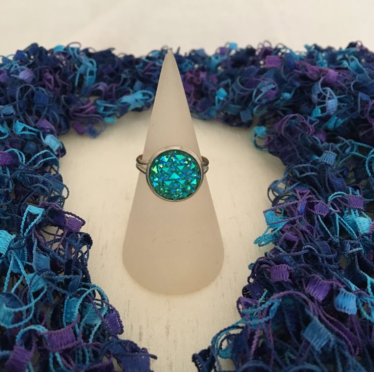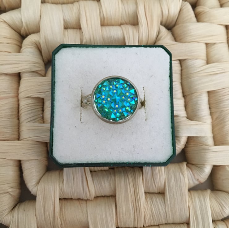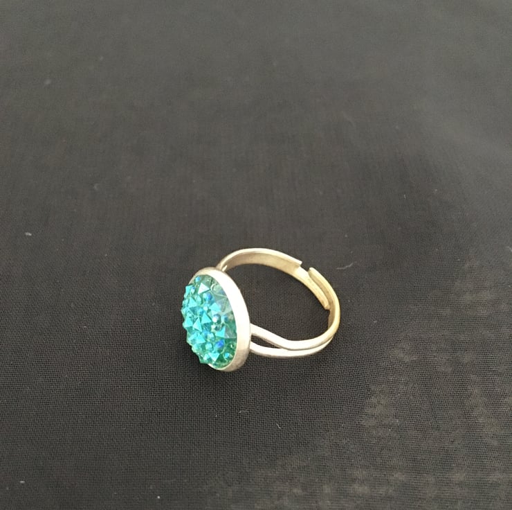 Gorgeous and pretty and glittering - the centre of this ring is made from resin, the angles of the particles reflect the light bringing the colours to life. Because the surface of the druzy stone is created using tiny pieces of resin it does not have a smooth surface.