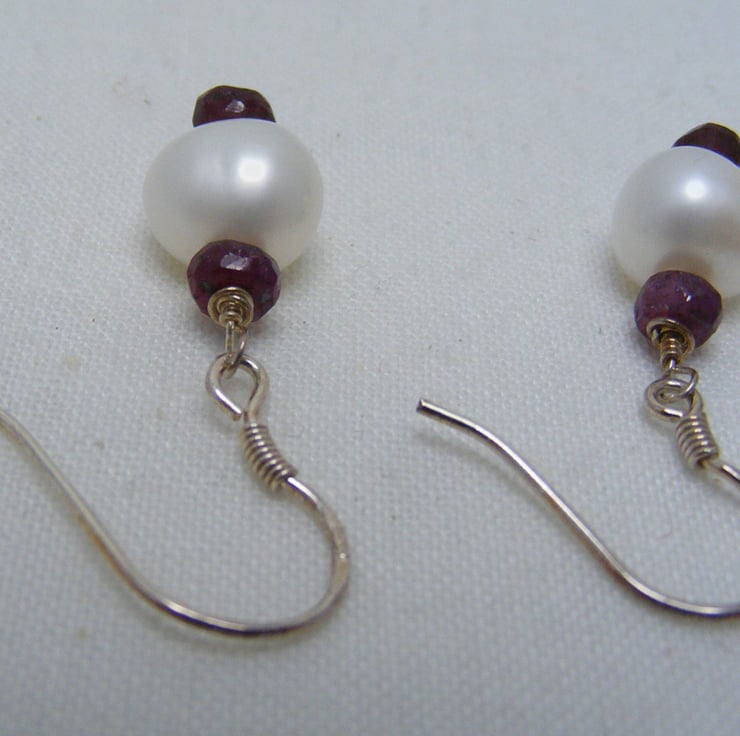 Earrings are handmade with, 3-4mm ruby faceted rondelles, 6x9mm white freshwater cultured baroque pearls and 925 sterling silver headpins and ear wires. 925 is stamped on the ear wires.