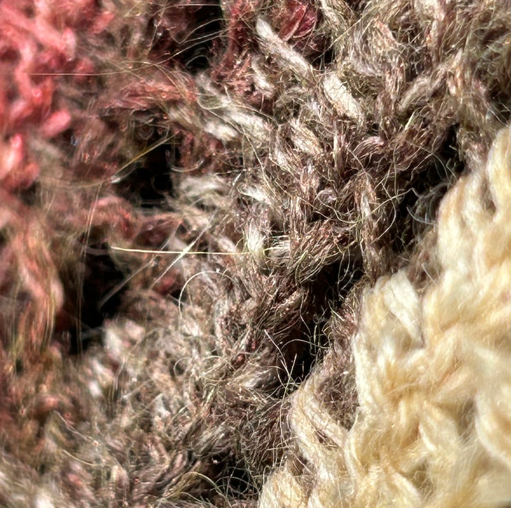 Hand made by me in super soft alpaca mix yarn in colour Bonfire. This yarn is very soft and cosy like any alpaca yarn. The Autumn colours flow into each other in a kind of rustic way.