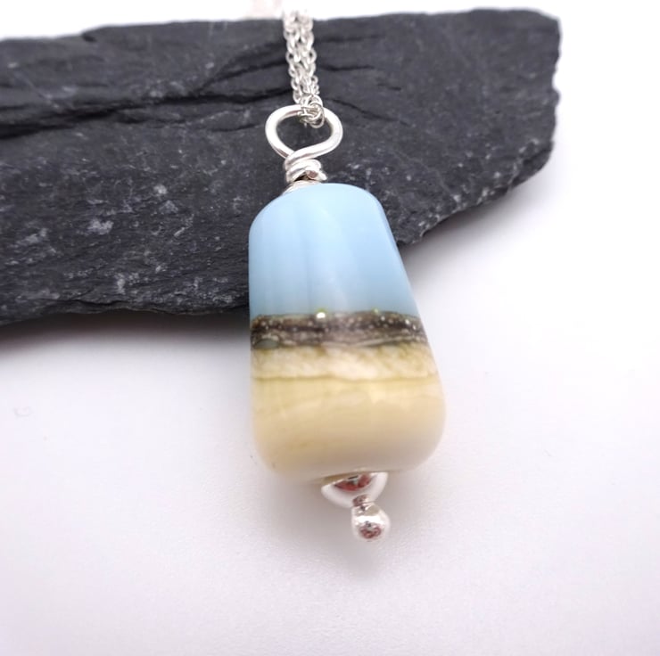 It features a sterling silver chain strung with a handmade lampwork glass pendant made with blue and ivory glass.