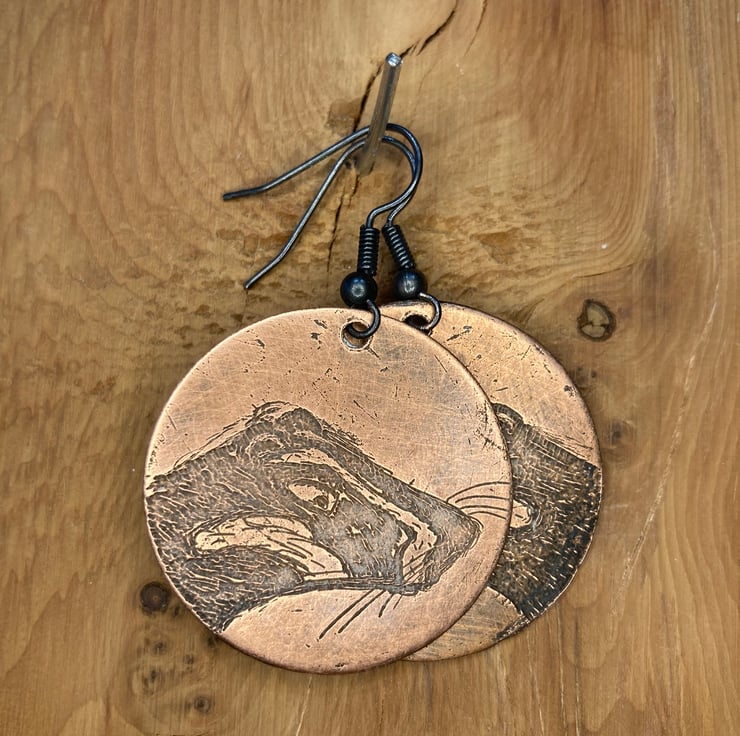 Acid etched copper earrings with Badger Portrait design
