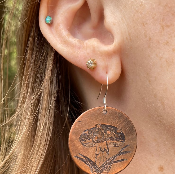 Acid etched copper earrings with Fly Agaric Mushroom design