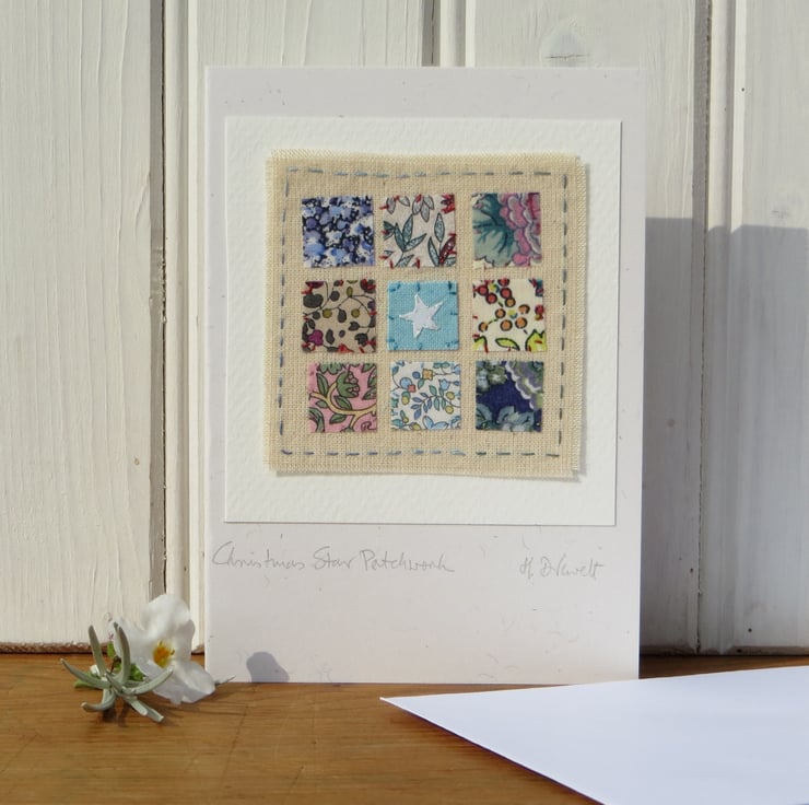 This is a small hand-made greeting card featuring a miniature hand-stitched applique 'patchwork' with white star in the centre. Made using pretty Liberty cotton prints with intricately embroidered stitching. It is entitled 'Christmas Star Patchwork' a special little card to keep!