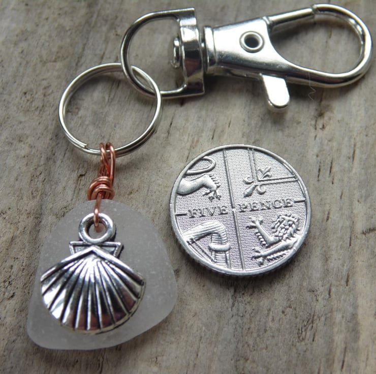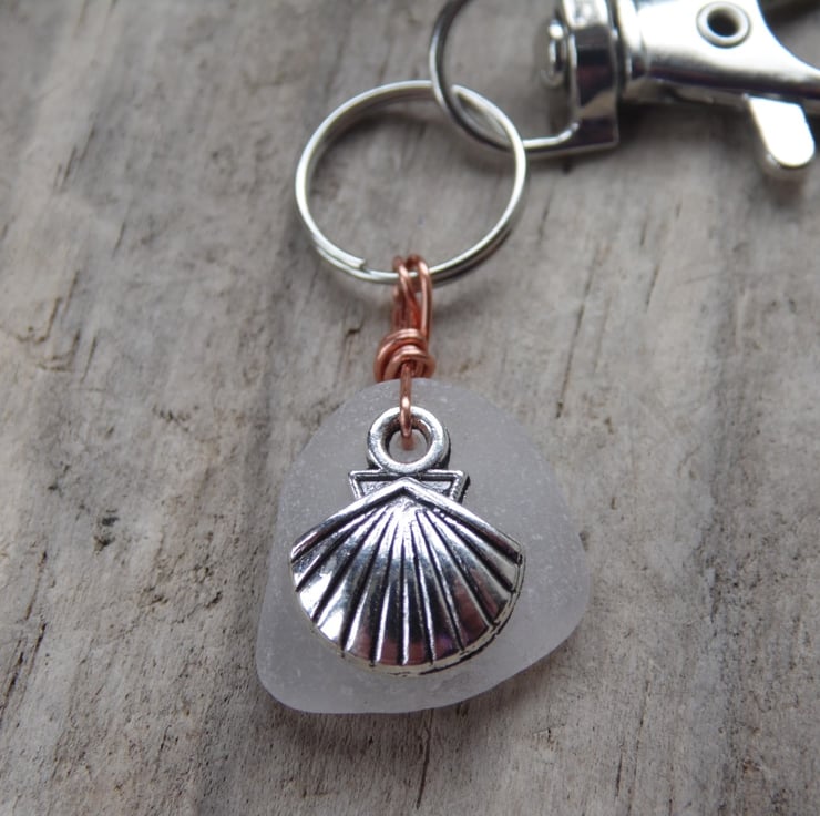 A beautiful piece of white Cornish sea glass with a silver coloured clam shell charm, wrapped in copper wire, on a silver coloured split ring and clip.