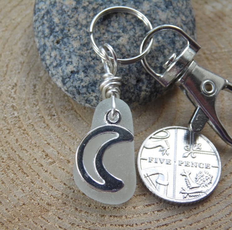 A beautiful piece of white Cornish sea glass with a silver coloured crescent moon charm, wrapped in silver plated wire, on a silver coloured split ring and clip.