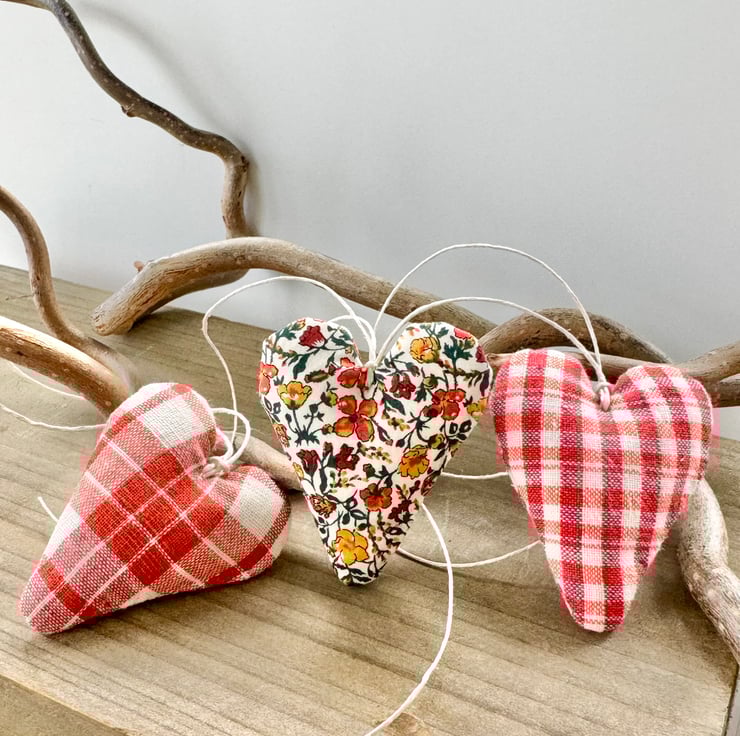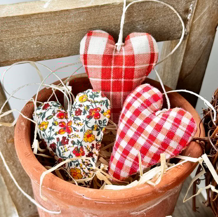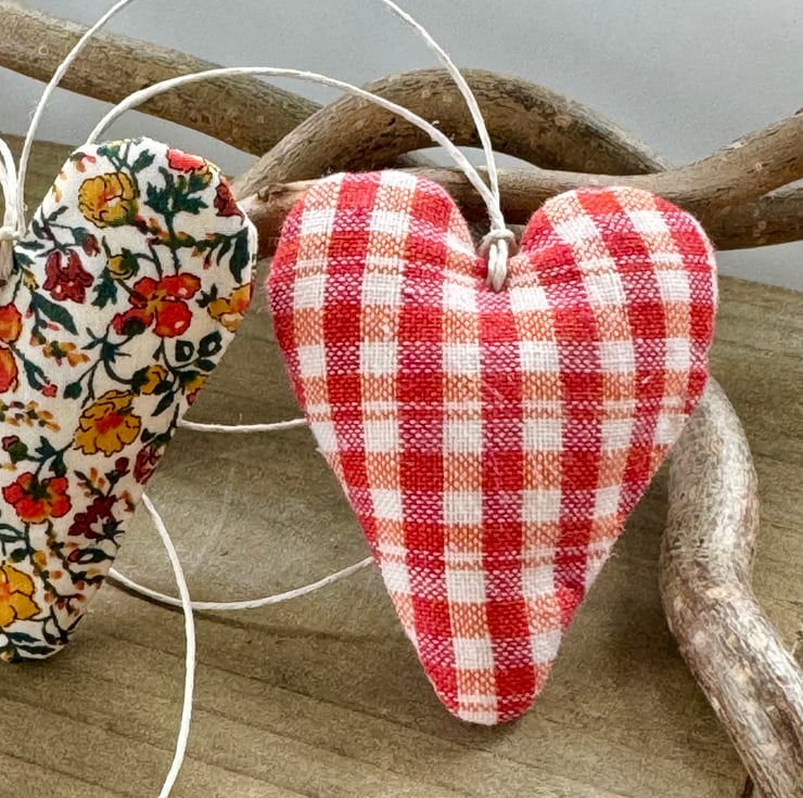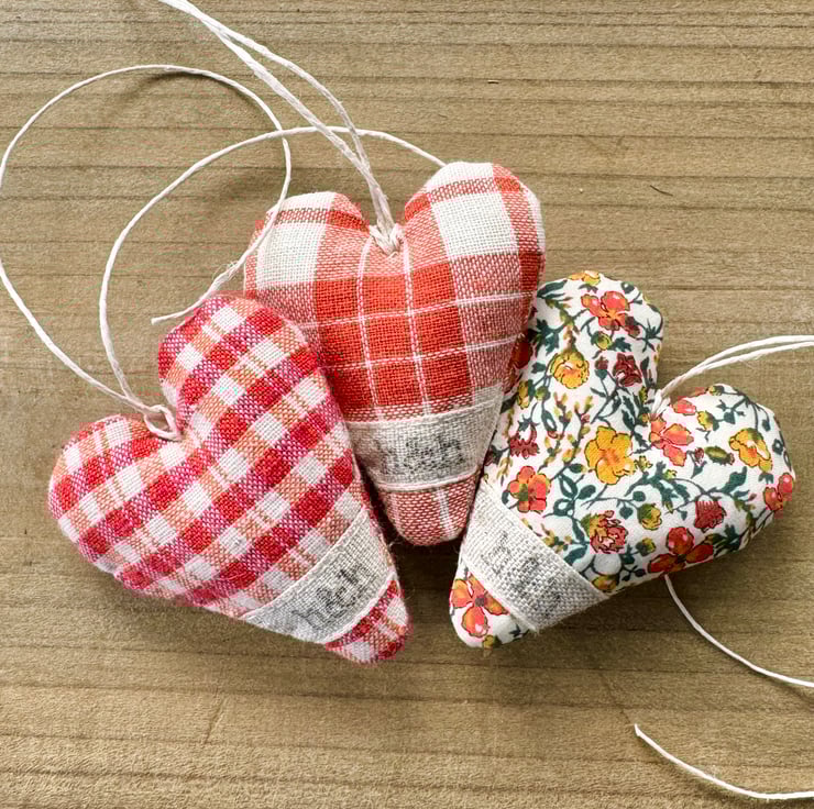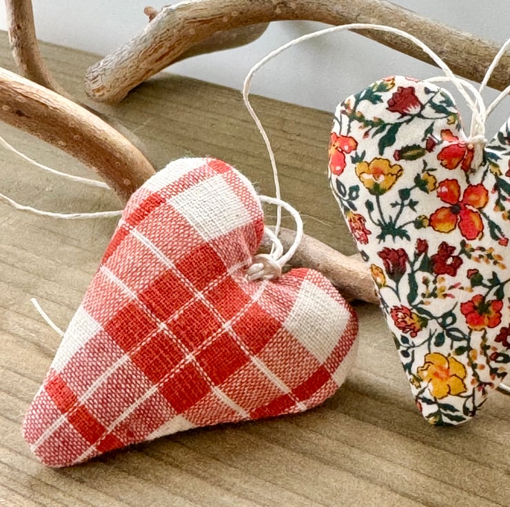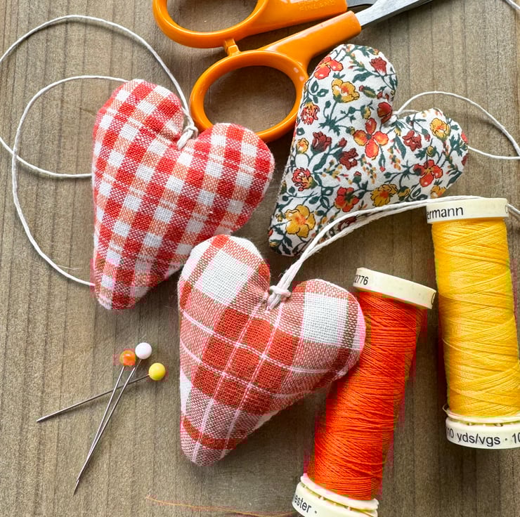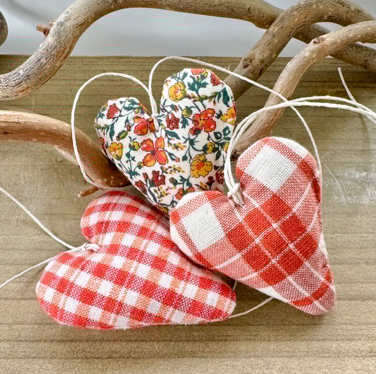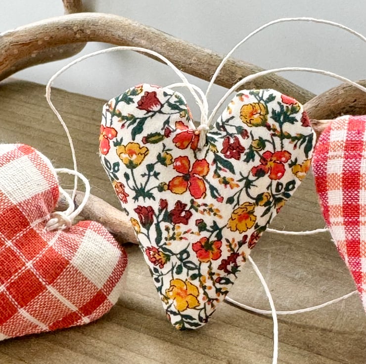 A trio of hanging hearts in complementary fabrics: burnt orange and white checks, light and dark orange gingham, and delicate florals featuring warm orange and yellow blooms.