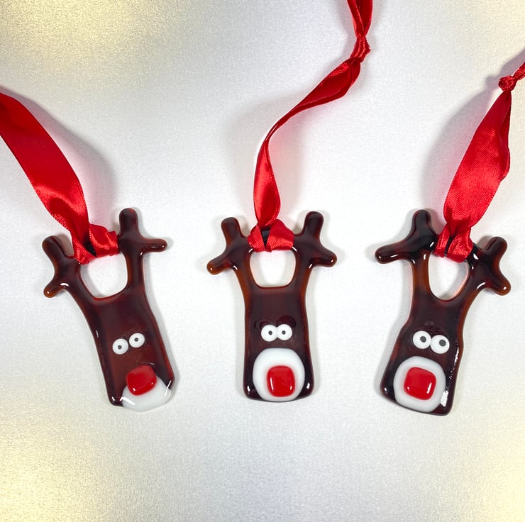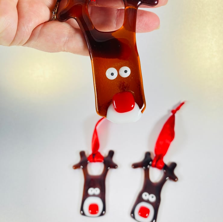 Fused glass deer with a bright red nose . Super cute and ready to hang on the tree . Strug with red satin ribbon . Created from dark amber transparent glass over two firings . Super little gift too . Each decoration is approximately 3 inches long