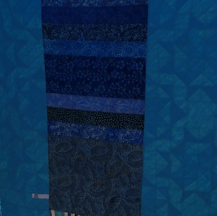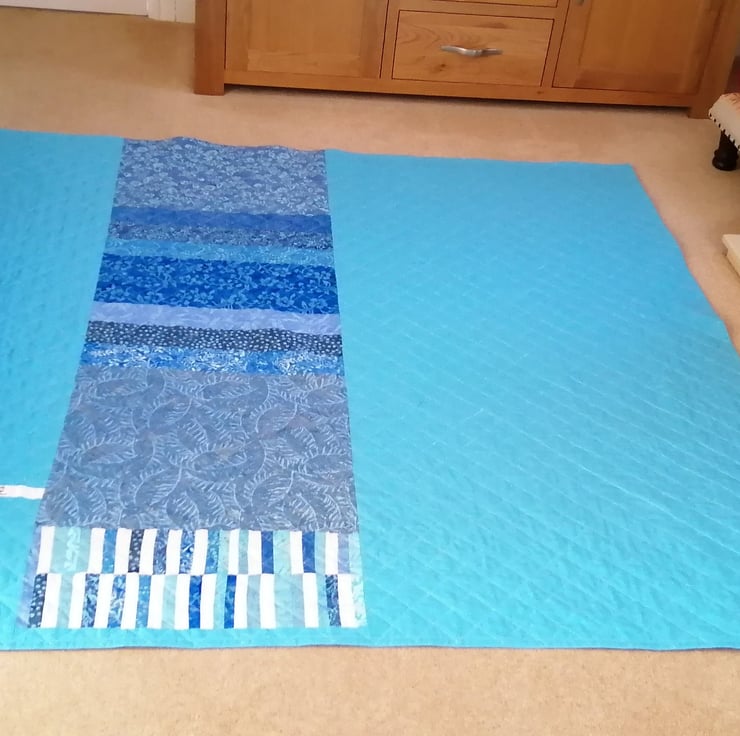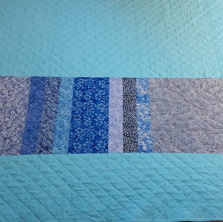 Beautiful handmade unique quilt made in England using soft cotton fabrics for breathability, comfort and durability. This quilt would bring a cool lightness to any room. It can be used as a bed topper or throw. It's versatile dimensions make it suitable for many uses. It has 100% cotton batting and backing. The back is pieced using a range of matching blue batik fabrics and a bright cotton turquoise...capturing a real taste of Summer!