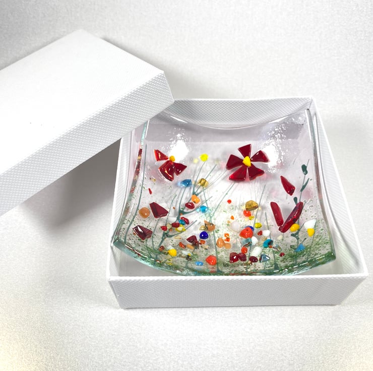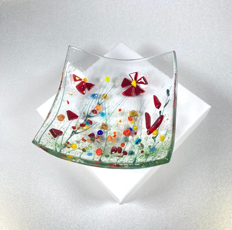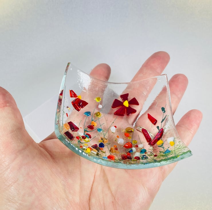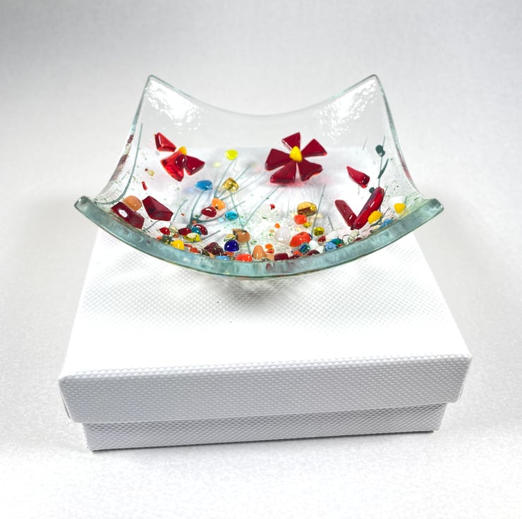 Fused glass floral trinket dish in perfect for small jewellery items , pills or just decorative . Such a pretty small dish which is perfect for gifting . Created over two separate kiln firings - each one approximately 24hrs. The gentle curve gives the dish a contemporary feel .