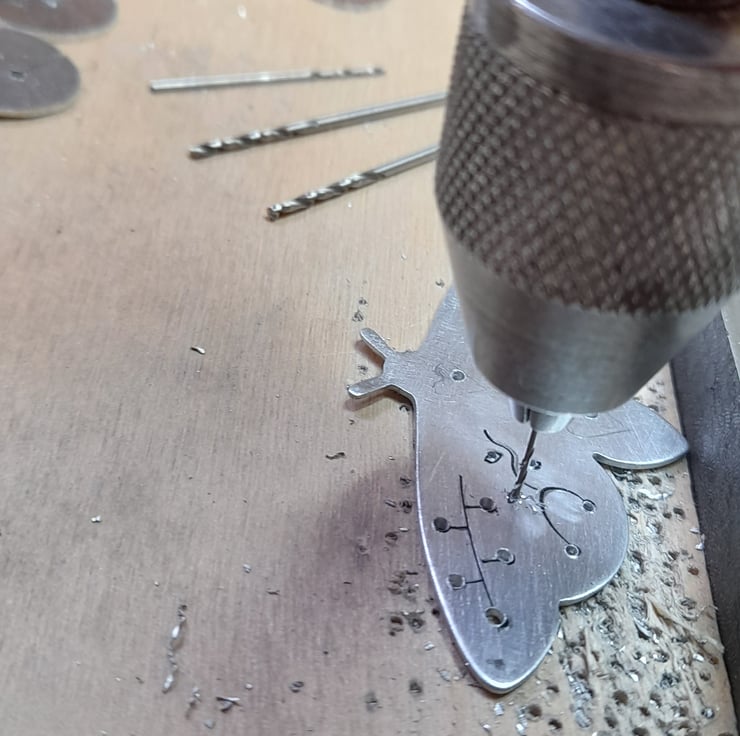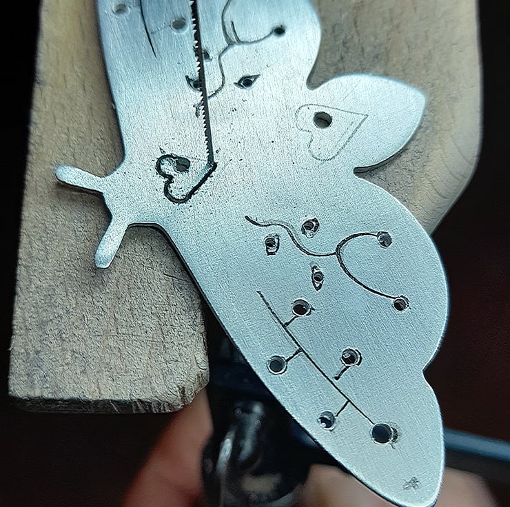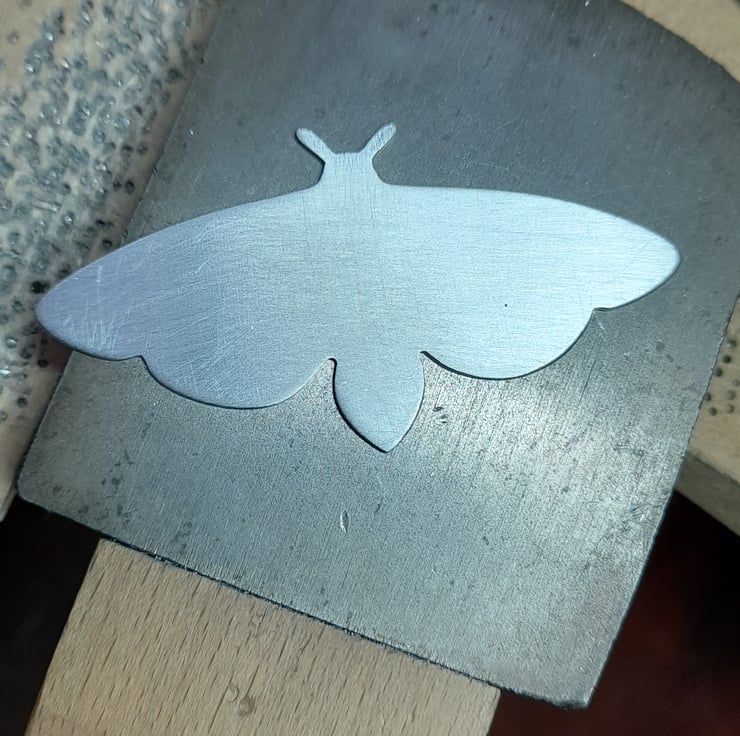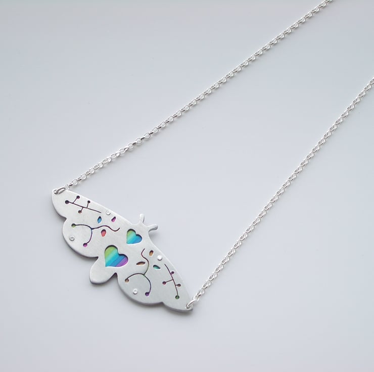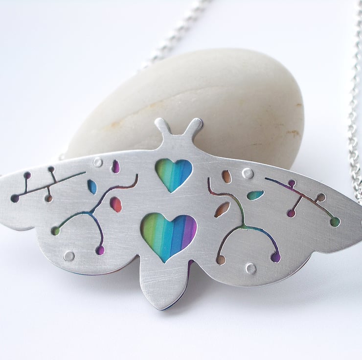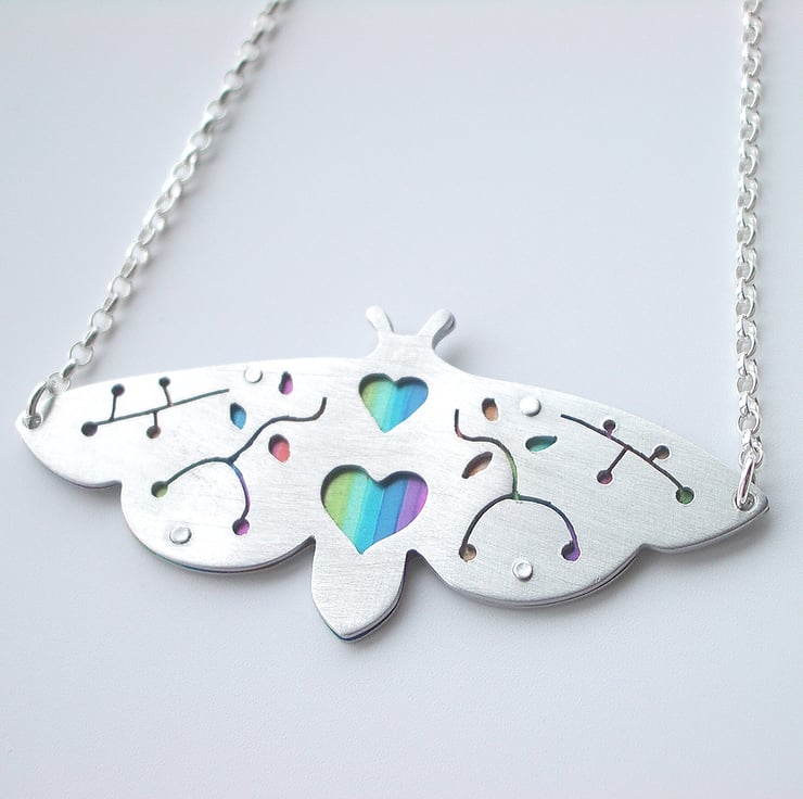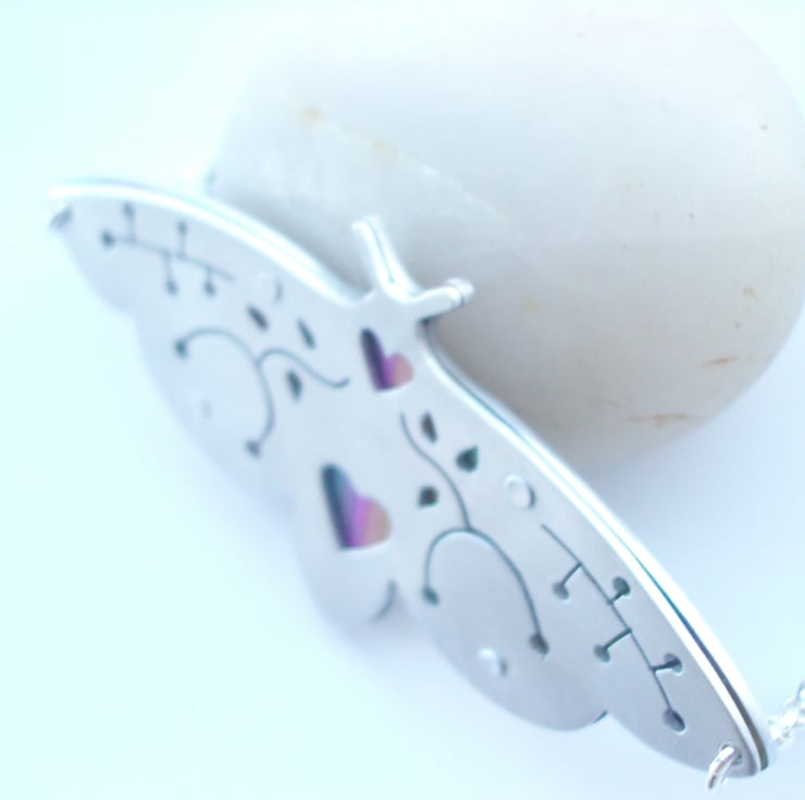 This moth pendant is made from aluminium. I have drawn out my moth design on to the aluminium and then saw pierced the shape and detailed patterns by hand using a jeweller’s saw. To add some colour I have attached a piece of hand dyed anodised aluminium which has a rainbow stripe design on it. It’s attached with four hand made rivets. Finally I file the edges and wire wool the surface to give a brushed metal look.