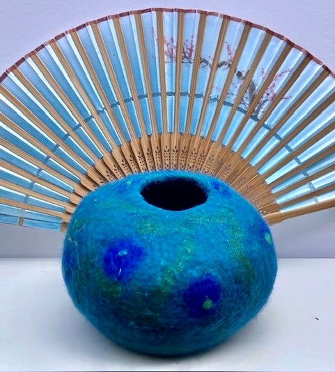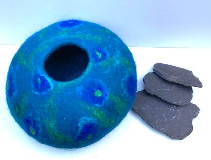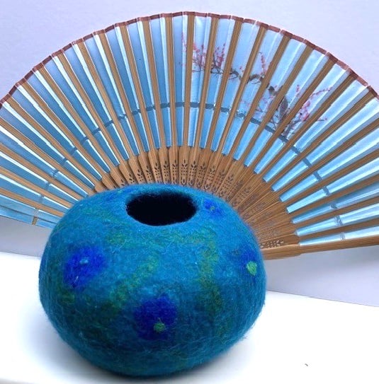 This pretty felted bowl has been made using the wet felting process which entails rubbing and rolling merino wool to create the desired shape. I have used different coloured merino wools and sari silks to create the flower design on the bowl.