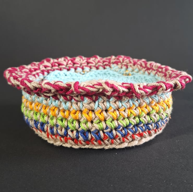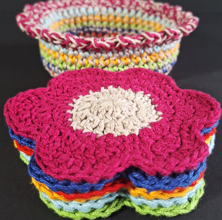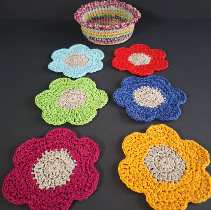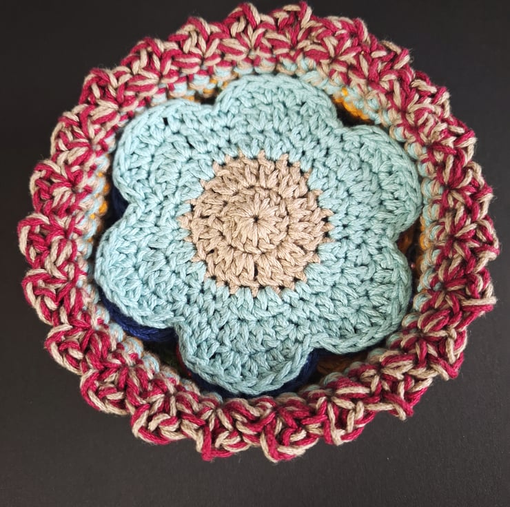I made these pretty coasters using premium, mercerised cotton yarn in sky blue, dark magenta pink, navy blue, scarlet red, mid green and golden yellow. Each coaster is a different colour flower. The centre of each flower coaster is light taupe.
