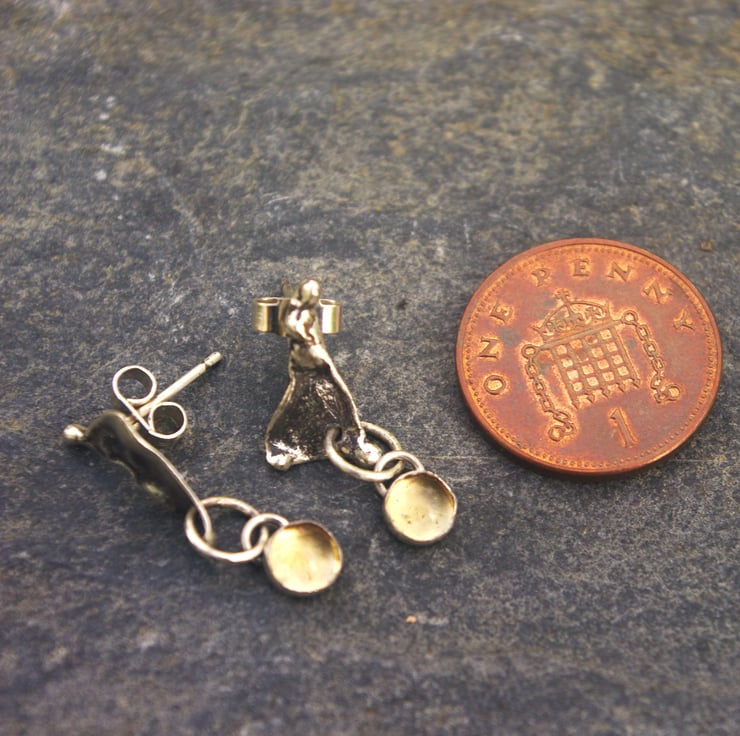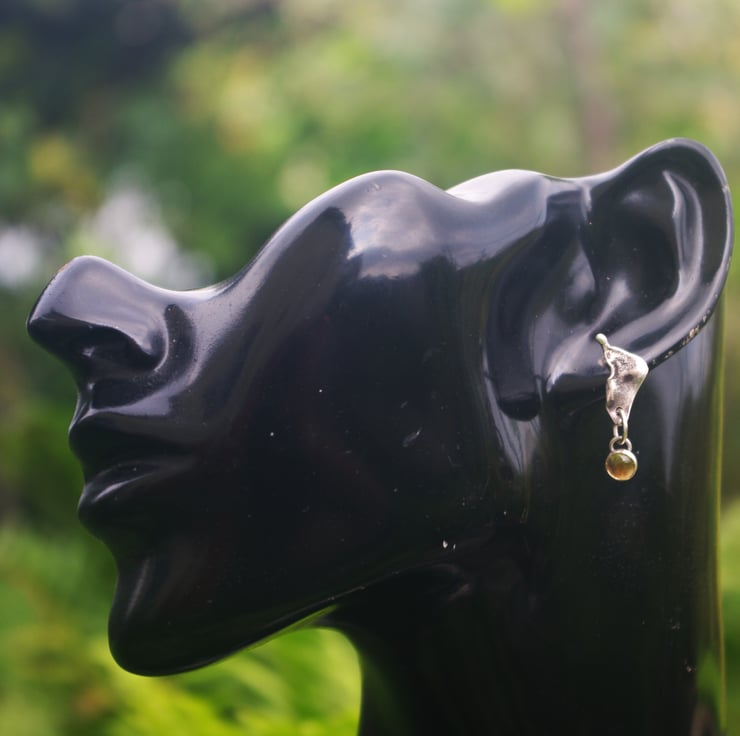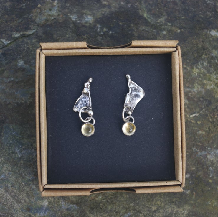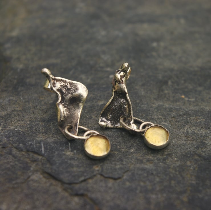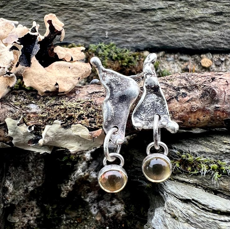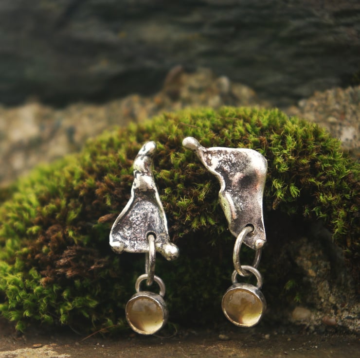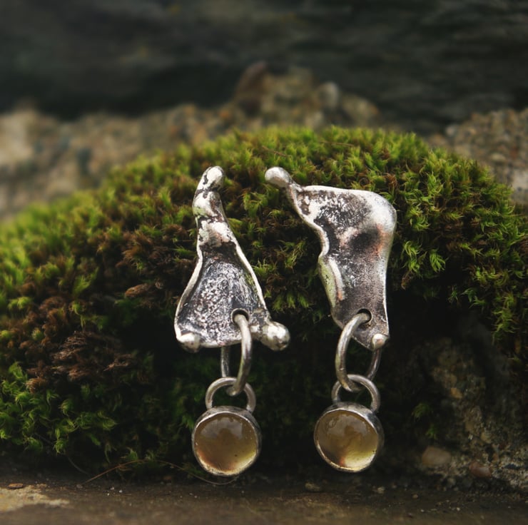 Textured sterling silver earrings, inspired by the moss and lichen, with Citrine dangles. The textures are achieved by heating up a scrap silver with added silver nuggets and silver dust. I have oxidised the pieces to accentuate these textures, which is preserved with a preserving wax.