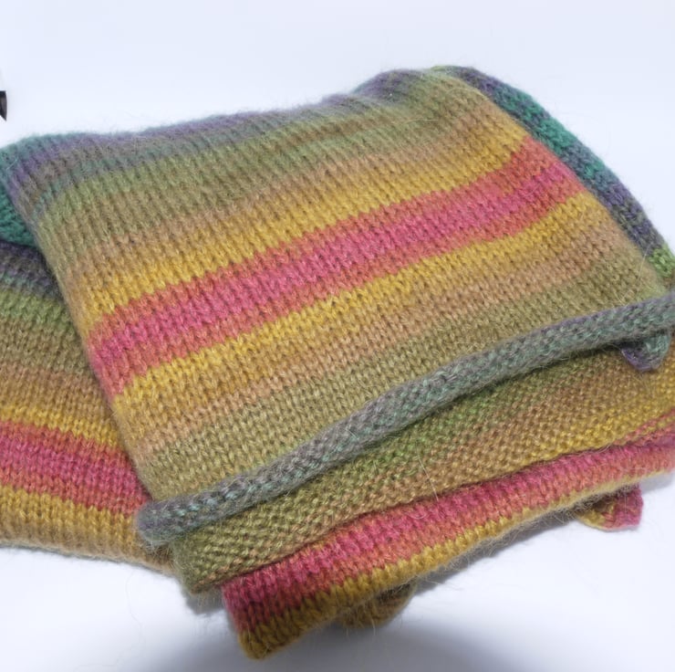 Hand knitted winter scarf in striped multicolours. This scarf is perfect for autumn/ winter and not to heavy. It can be machine washed as it is a acrylic/ wool blend, and left to dry flat. We will include a care tag.