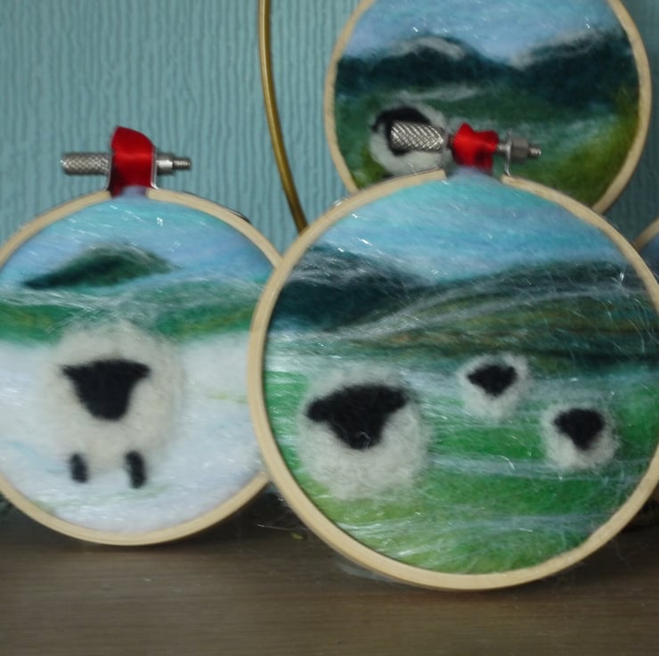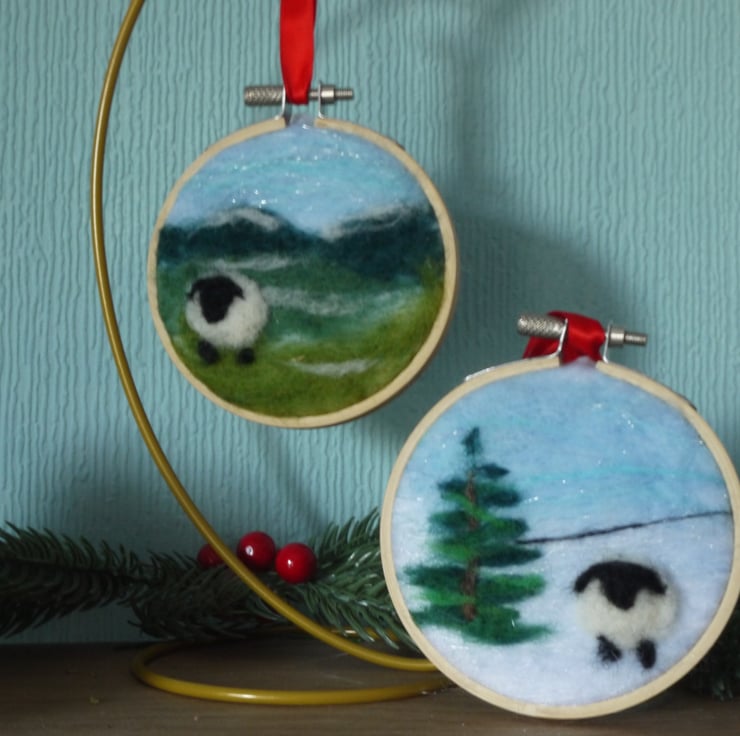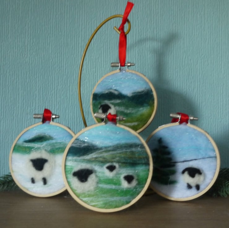 Handmade needle felted country christmas decorations inside embroidery hoops. Each decoration measures 4 inches and is made with mixed felting wools and fibres, featuring images of the countryside and sheep. These are limited and are a one off set. so once sold we wont have anymore.
