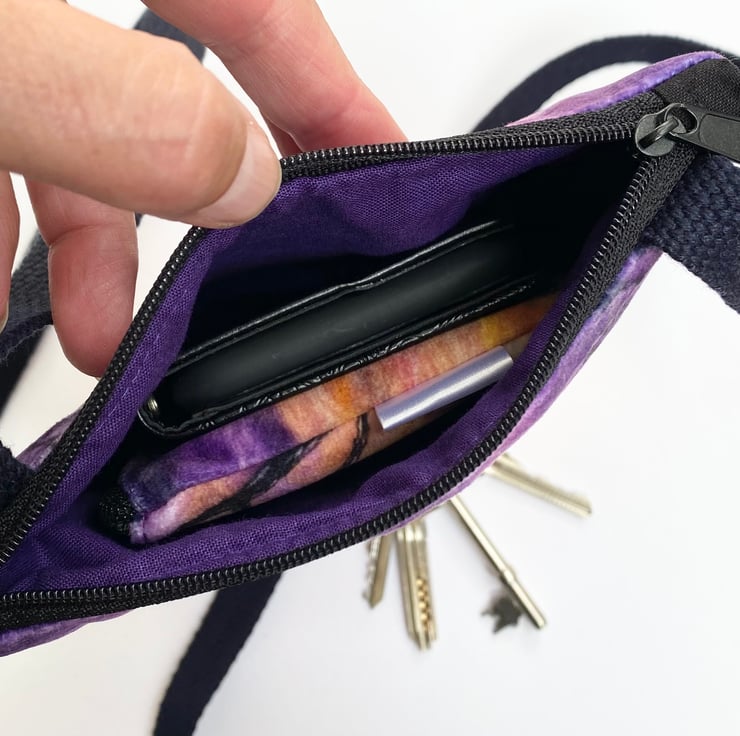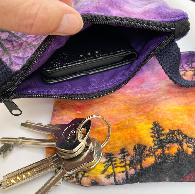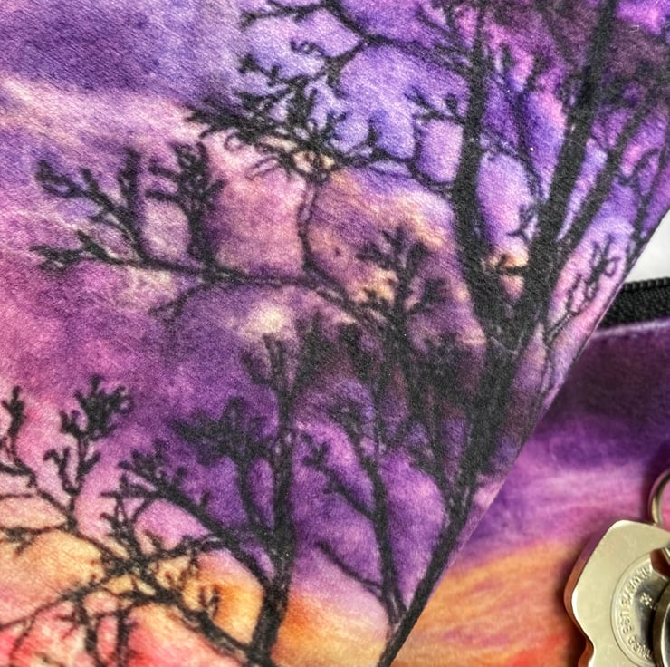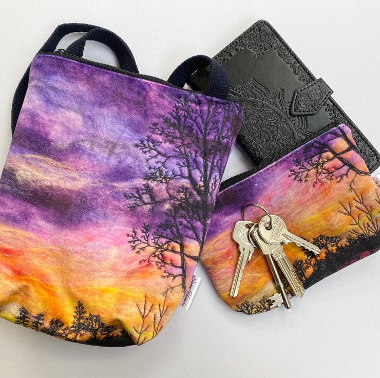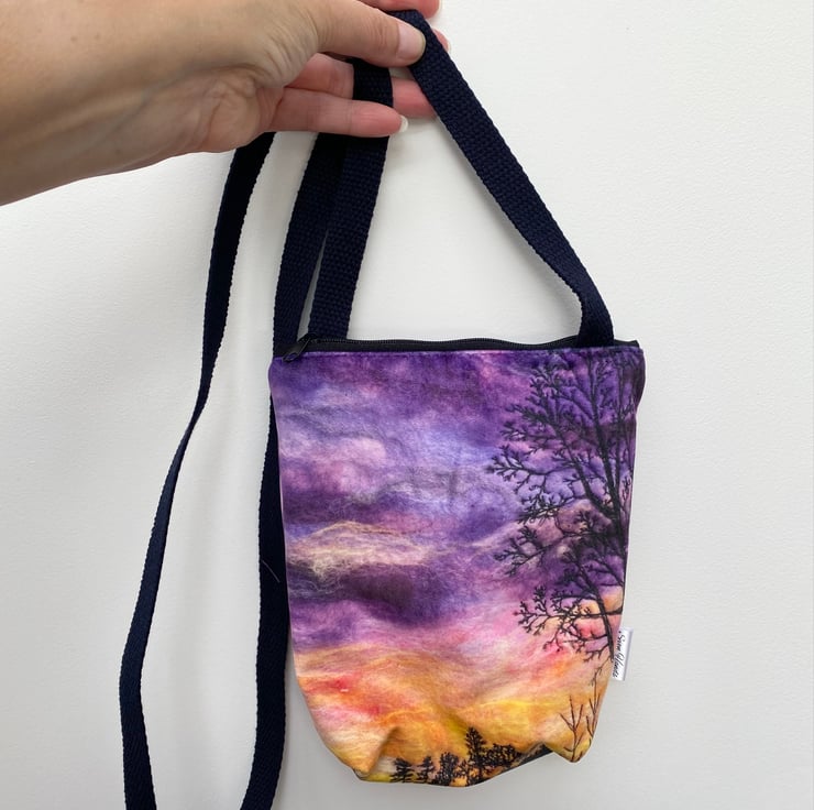 This beautifully soft zip evening or special occasion bag is decorated with a print of one of my embroidered wet felt pieces. The design has a stunning sunrise behind trees. It’s cotton lined inside and has a matching coloured zip with a long strap. The print is on the front and back.