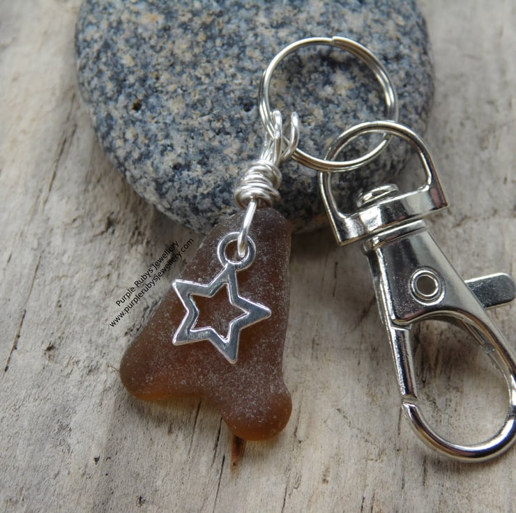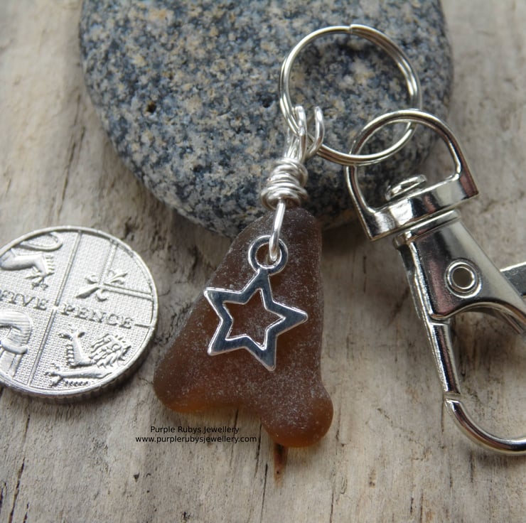 A beautiful piece of light amber Cornish sea glass with a silver coloured star charm, wrapped in silver plated wire, on a silver coloured split ring and clip.
