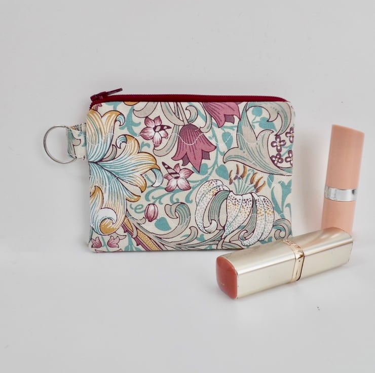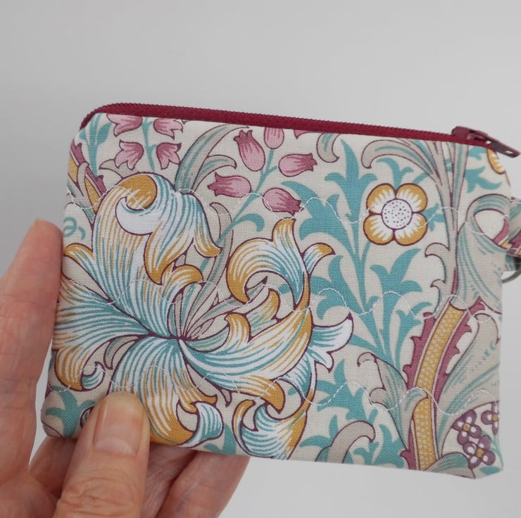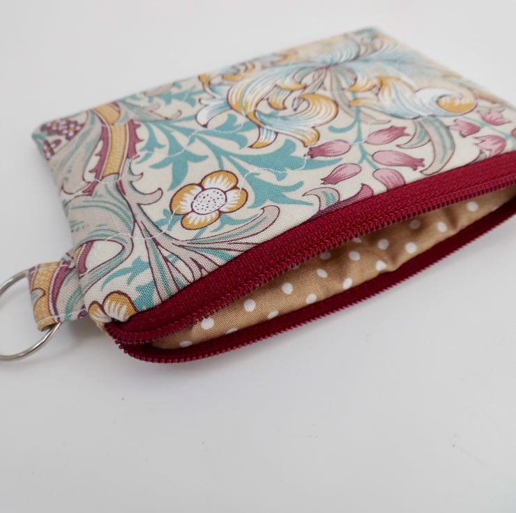 This coin purse is made in William Morris design fabric called Golden Lily in Dusk which has aqua and dark pink colours. I backed this cotton fabric with fusible fleece for cushioning, stability and a quality feel and then machine stitched with wave stitch three lines across front and back. Lined with coffee and cream colour spotted cotton.