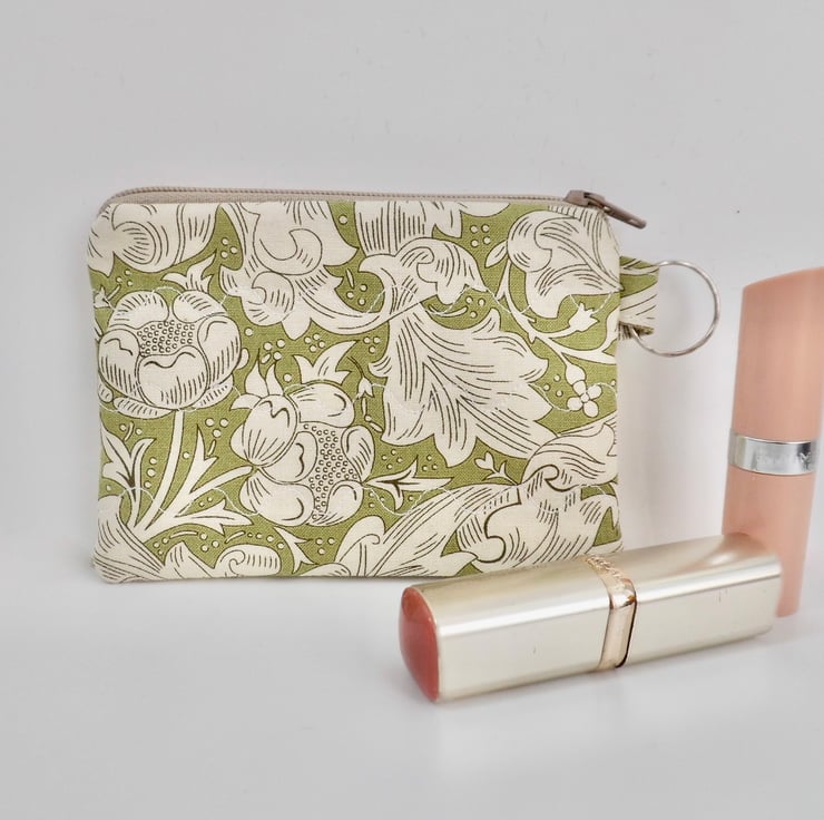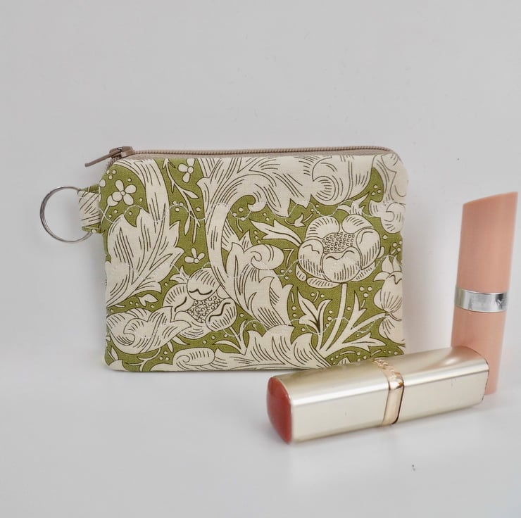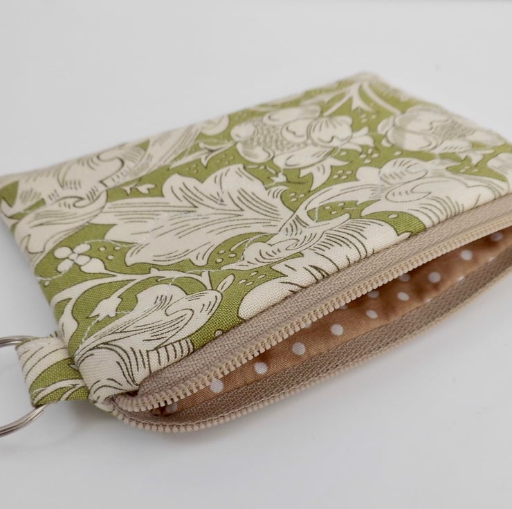 This coin purse is made in William Morris design fabric called Bachelors Button which has a leaf green background and a print of scrolling leaves. I backed this cotton fabric with fusible fleece for cushioning, stability and a quality feel and then machine stitched with wave stitch three lines across front and back. Lined with coffee and cream colour spotted cotton.
