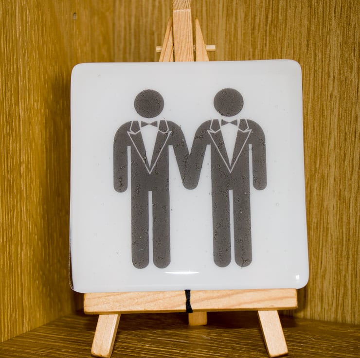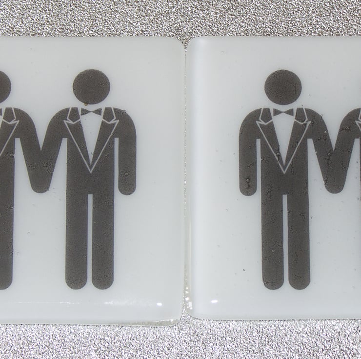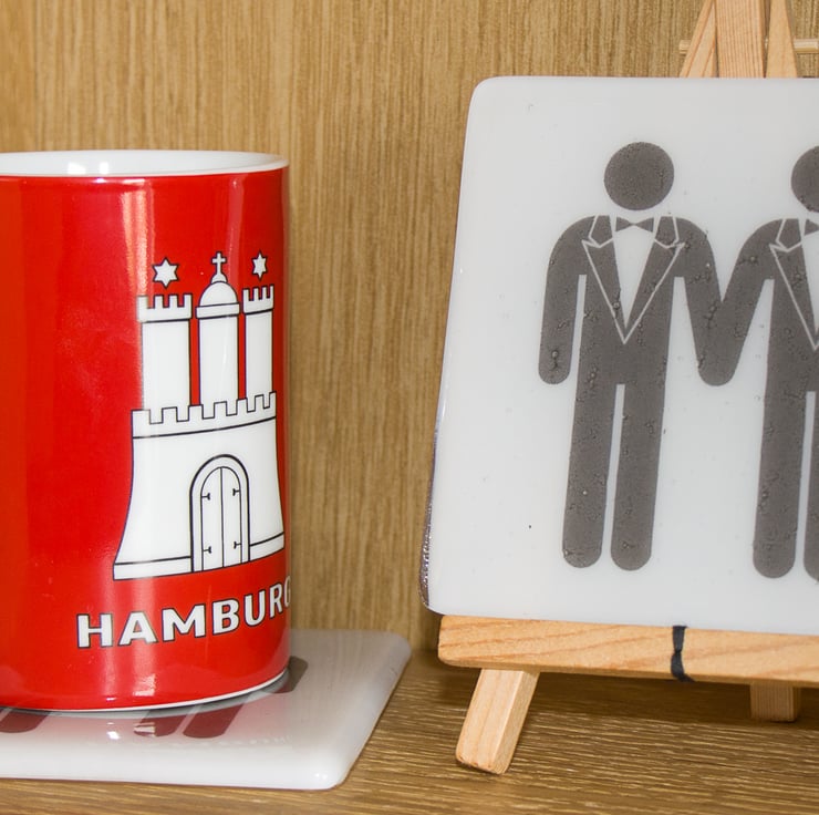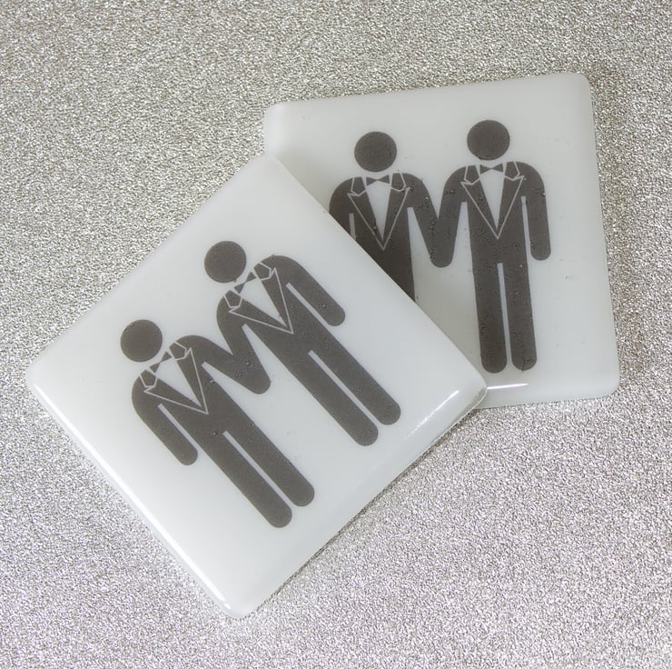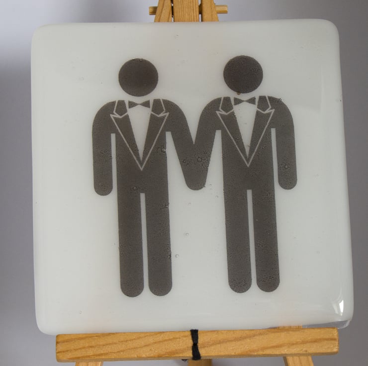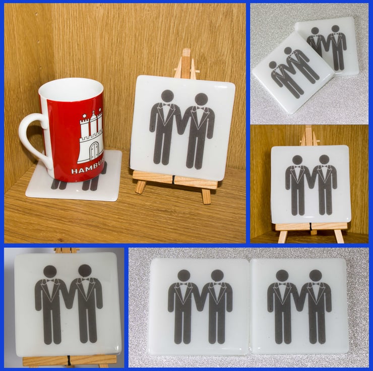 The image of the two gentlemen is printed by a specialist onto special high-temperature paper. We sandwich the image between a 10 cm square of white glass and cover it with a square of clear glass. A session in the kiln fuses everything together and rounds off those sharp edges. Once it has cooled to room temperature we attach little rubber feet to protect your surfaces even more.