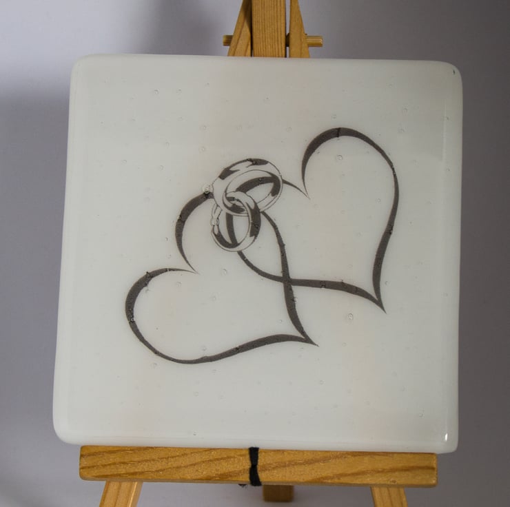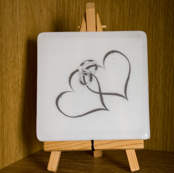 The image of the two interlocked hearts and rings is printed by a specialist onto special high-temperature paper. We sandwich the image between a 10 cm square of white glass and cover it with a square of clear glass. A session in the kiln fuses everything together and rounds off those sharp edges. Once it has cooled to room temperature we attach little rubber feet to protect your surfaces even more.