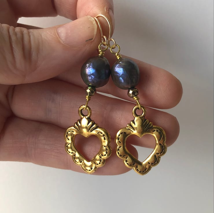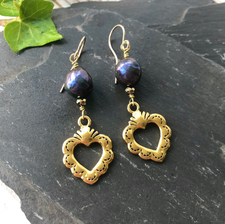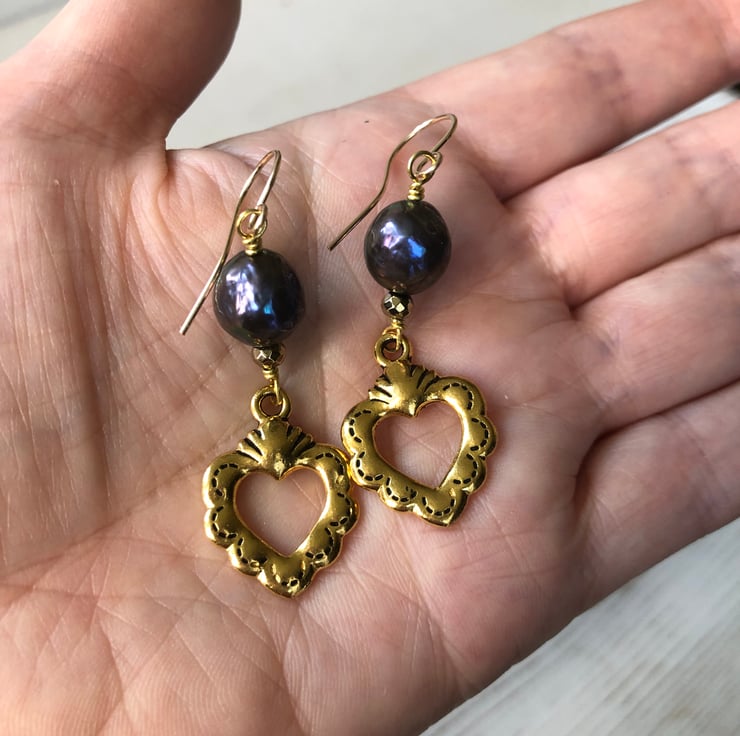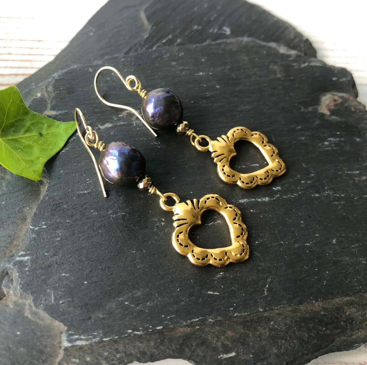 Dangly heart earrings with 10mm black freshwater pearls & rare Tierracast antique gold colour alloy sacred hearts that are the same front and back. The earrings are finished with gold-filled hooks.