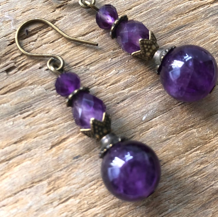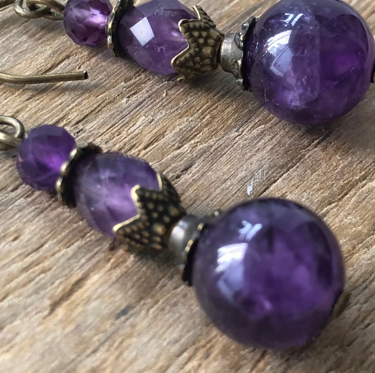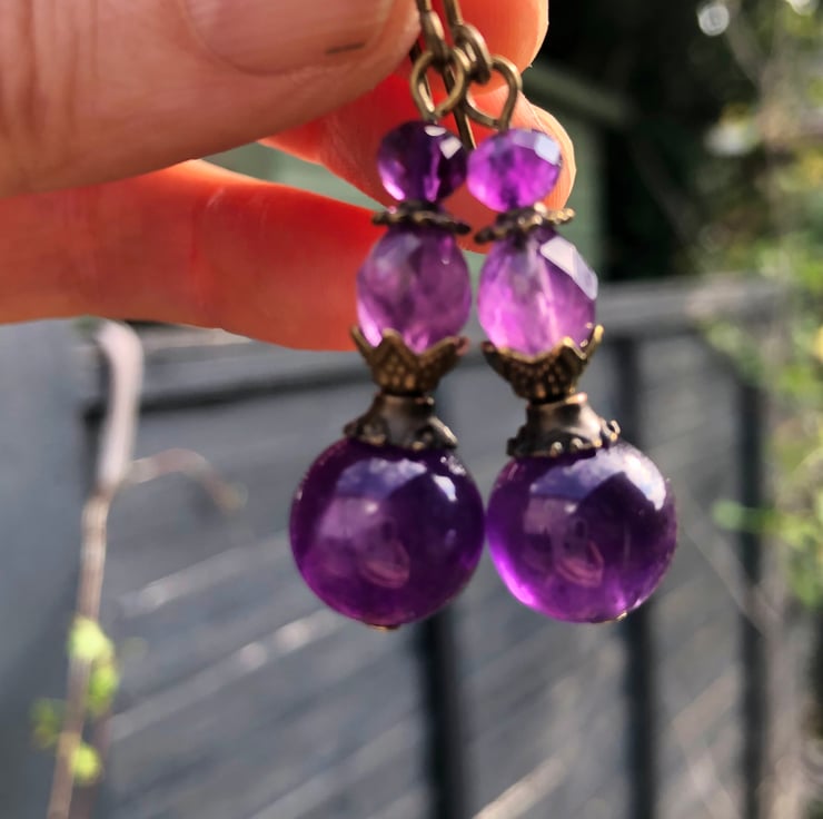 Lovely dangly vintage style earrings with stacked Amethyst gemstone beads and bronze tone bead caps finished with handmade bronze tone hooks.