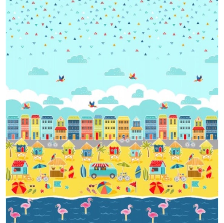 A lovely double border fabric panel by Makower featuring a beach scene. Perfect for making into a padded fabric bag for the beach. Measurements approximately 42 x 21 ins.