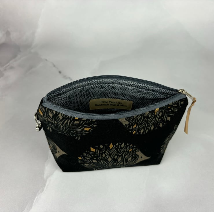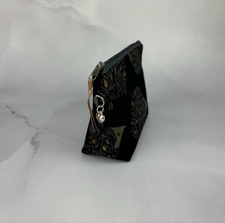 Handmade flat bottomed zip bag in a fun modern cotton fabric accented in gold and lined in a grey patterned cotton.