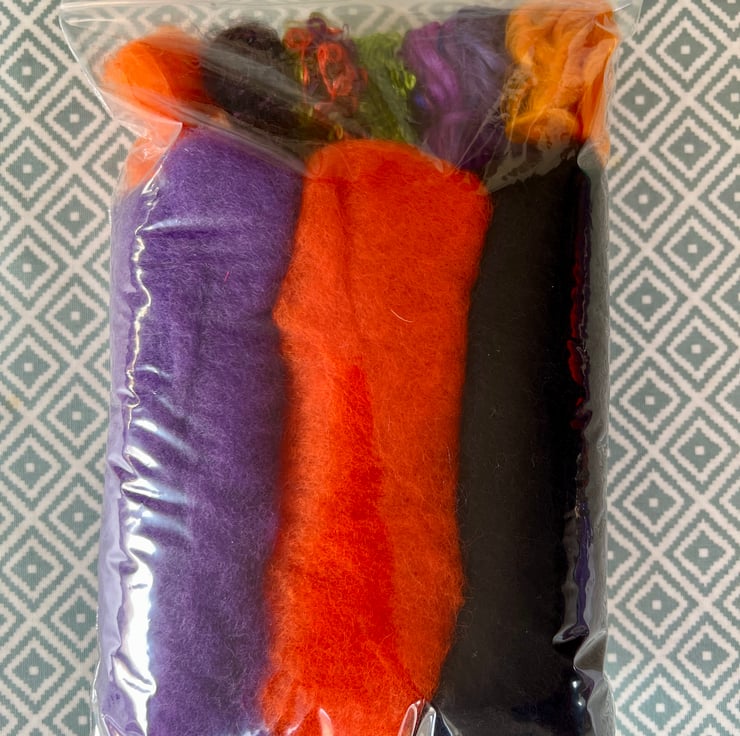 This kit includes all the materials required to make one bowl with an optional turned-over rim (and you will have some materials left over) in a Halloween orange, black and purple colourway. The photos show an example of a bowl made from the kit. Please note that you will need to purchase your felting on a ball equipment separately (you will need the smaller green felting ball for this project - see separate listing).