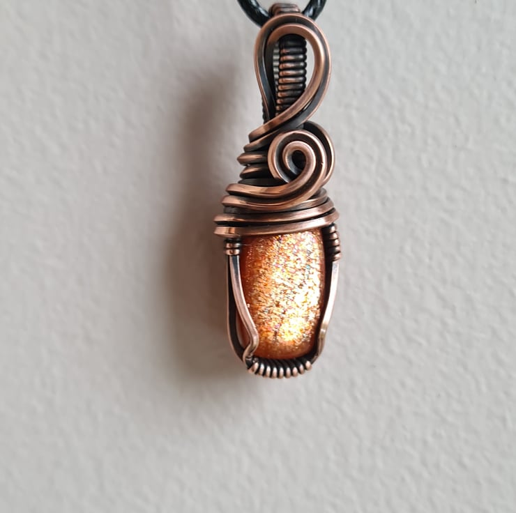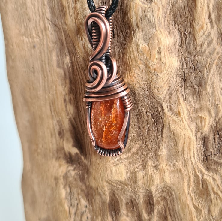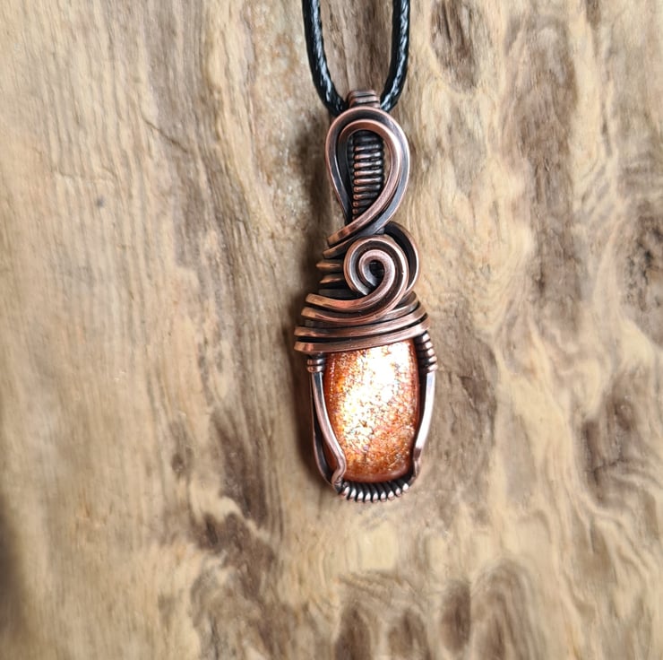 I have taken this lovely shimmering top quality Natural Sunstone and handwrapped it in raw copper, which I have then antiqued and polished for the final effect. This Sunstone has a lovely energy and glittery flash to it, and looks amazing teamed with the copper.