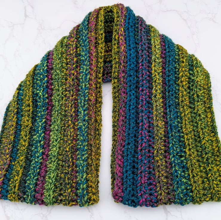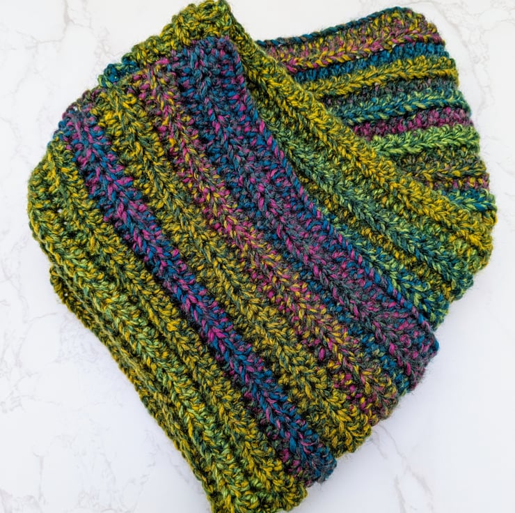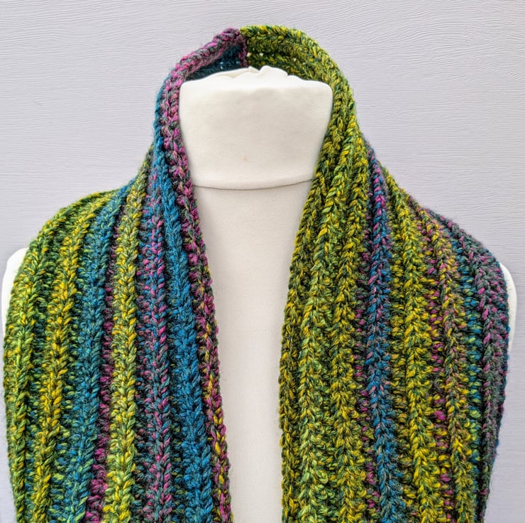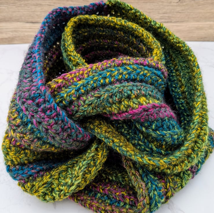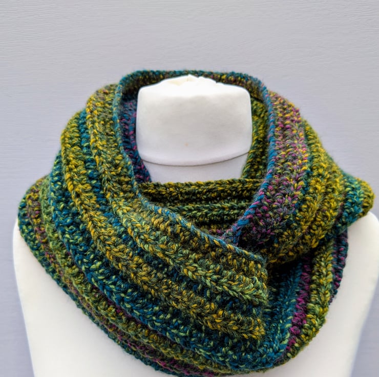 Crocheted infinity scarf in shades of greens,berry and storm blue.