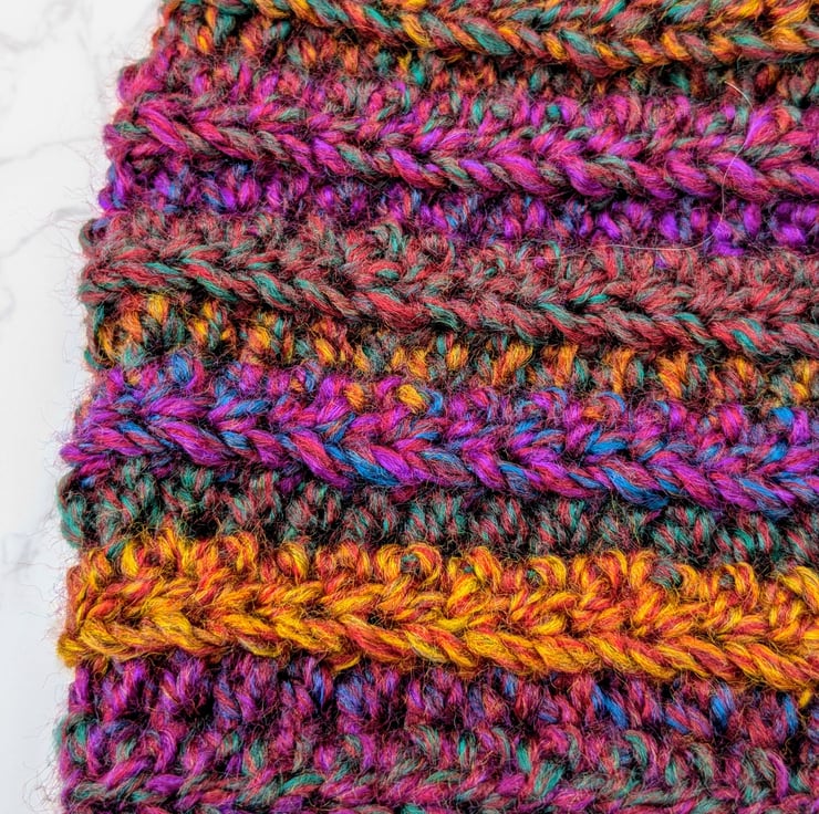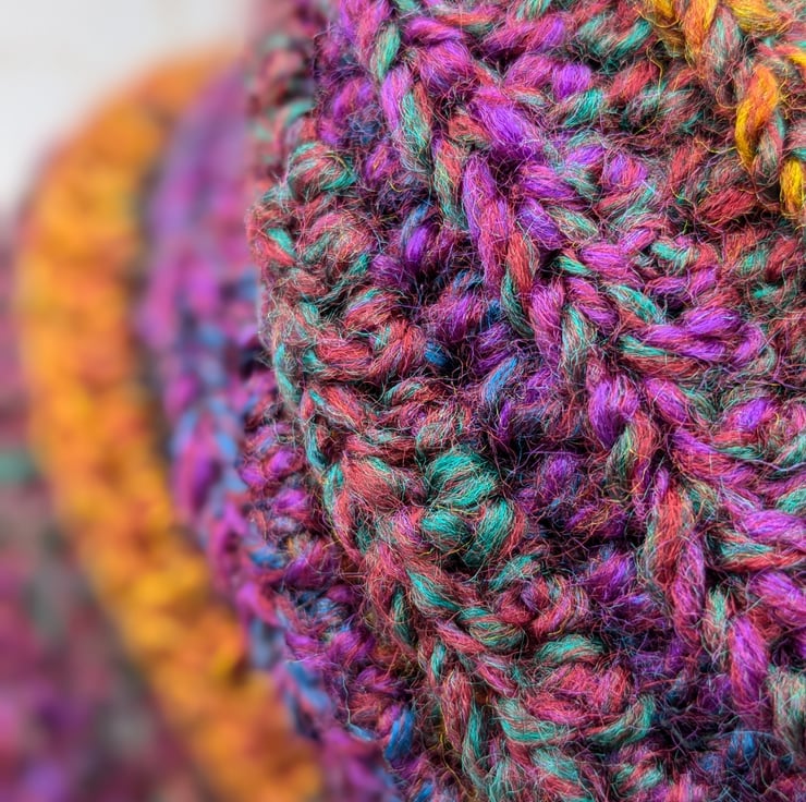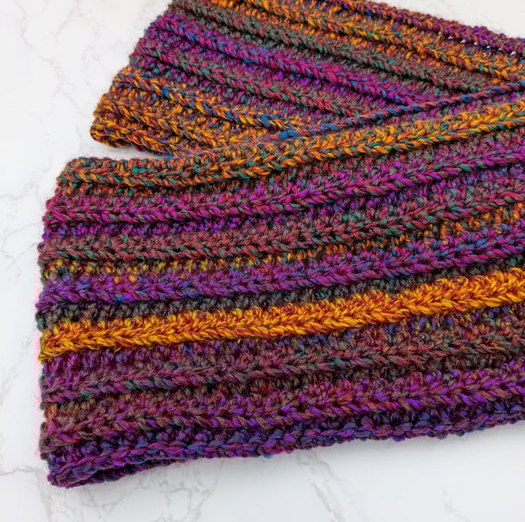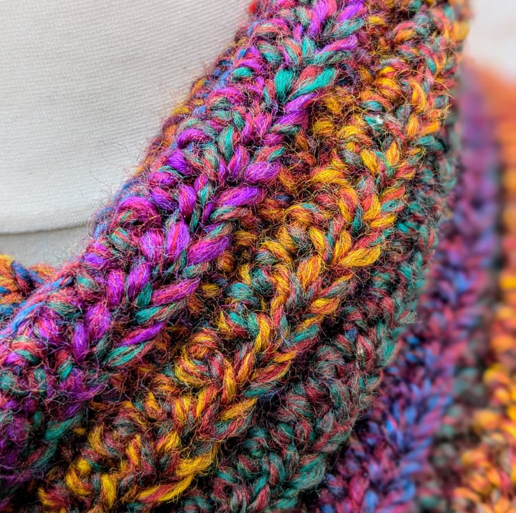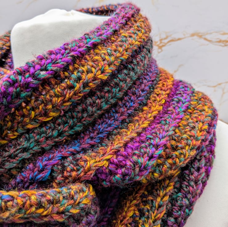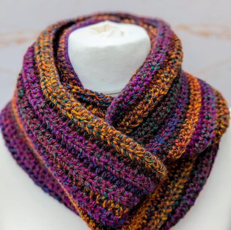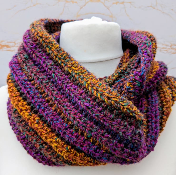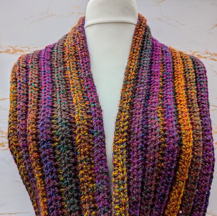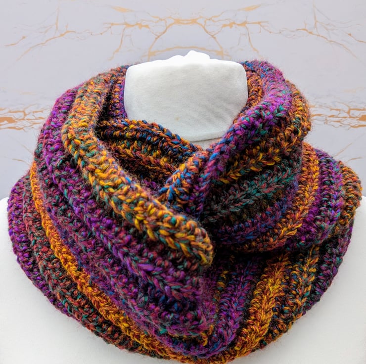 Crocheted infinity scarf in shades of rust,greens and purples.