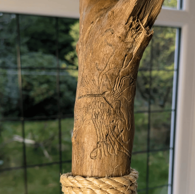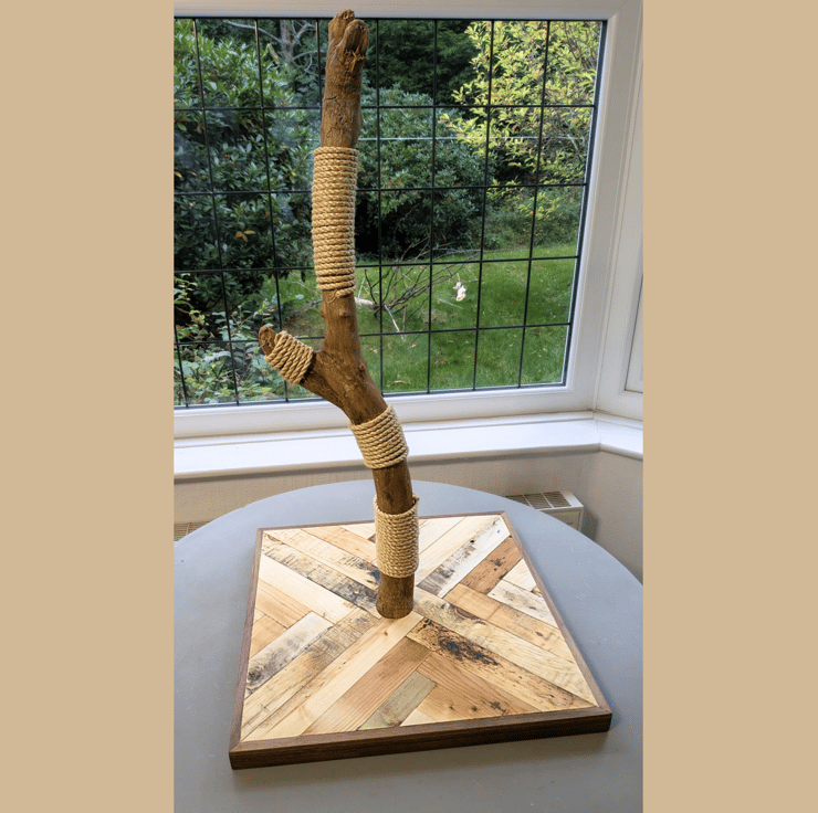 Discover the perfect blend of style, sustainability, and craftsmanship with our handmade scratching tower. Featuring a weighty, sturdy base made from reclaimed wood and framed in solid walnut, this piece ensures stability for even the most energetic cats. The post is crafted from an exquisite piece of driftwood sourced from the Pembrokeshire Coast, wrapped in premium natural sisal for an ideal scratching surface.