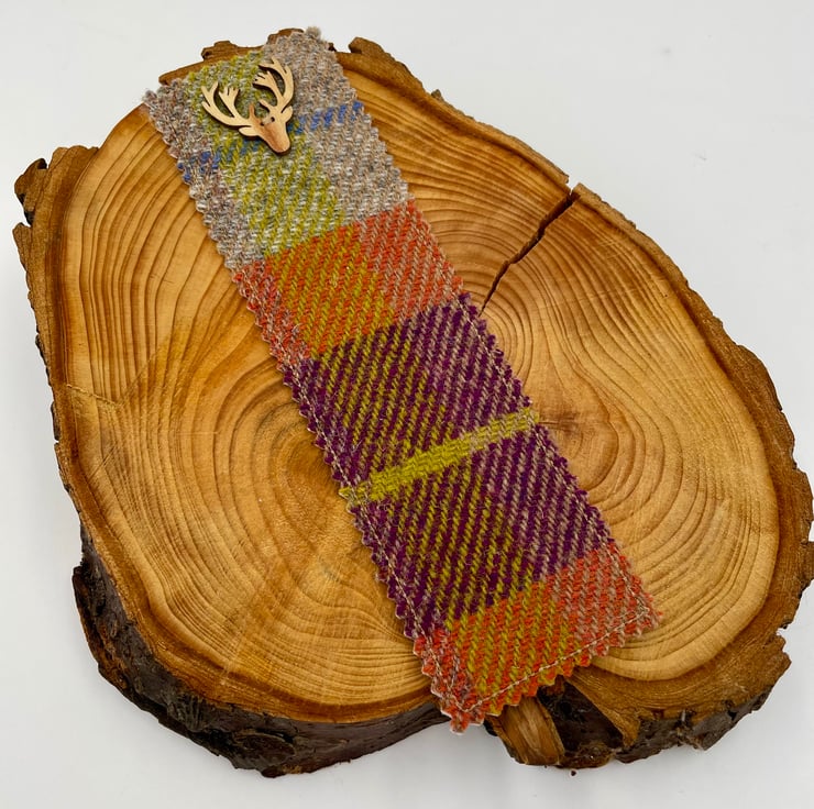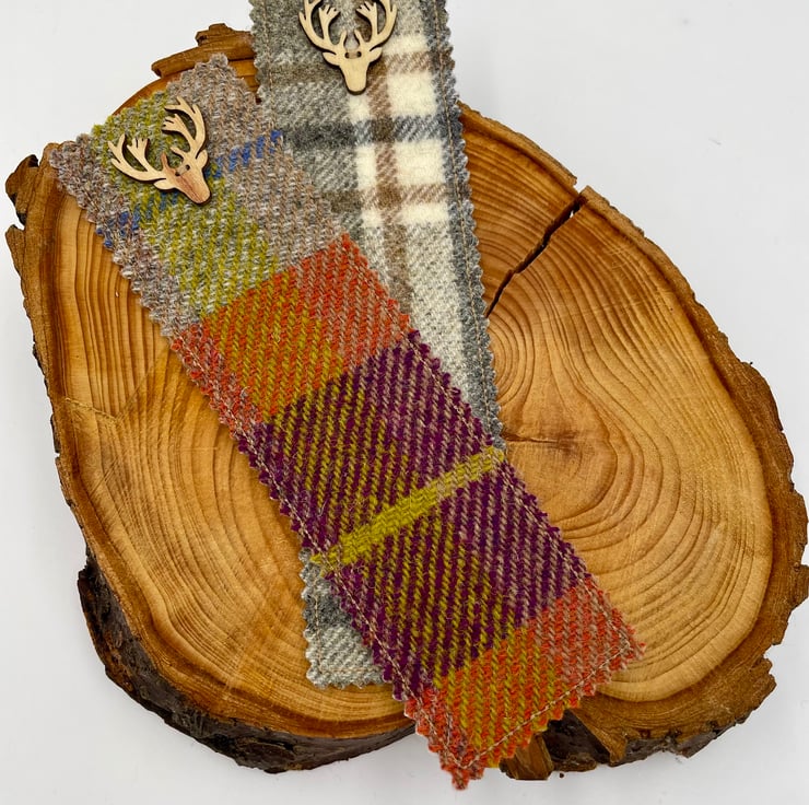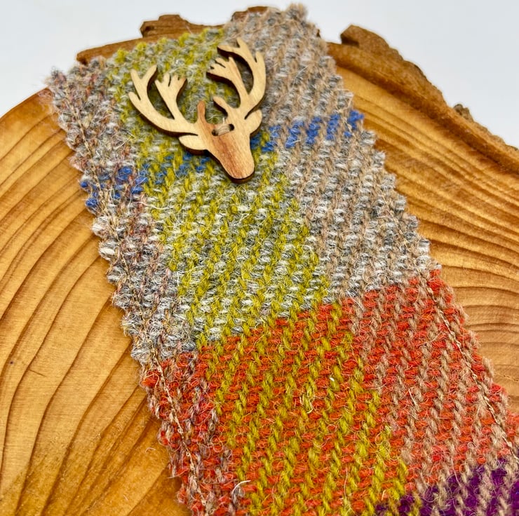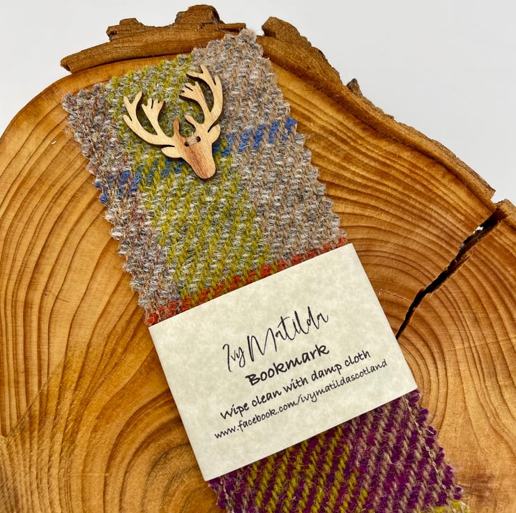 Celebrate the beauty of the season with this cozy tweed bookmark in rich autumnal hues. The warm, earthy tones of the tweed evoke crisp fall days, while the striking stag button detail adds a rustic, woodland charm. Perfect for marking your spot in a favorite book, this bookmark brings a touch of the countryside to your reading routine—ideal for those who love nature and a cozy autumn vibe!