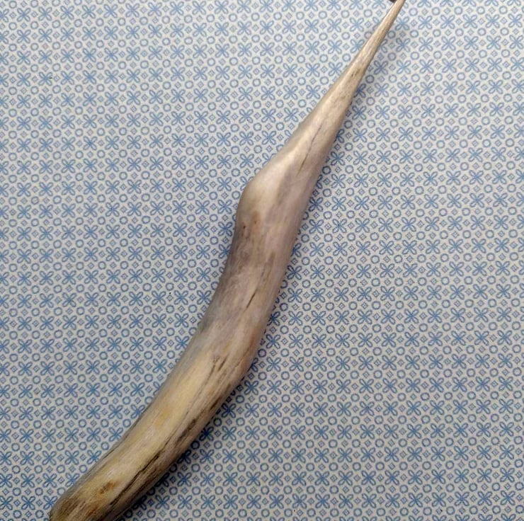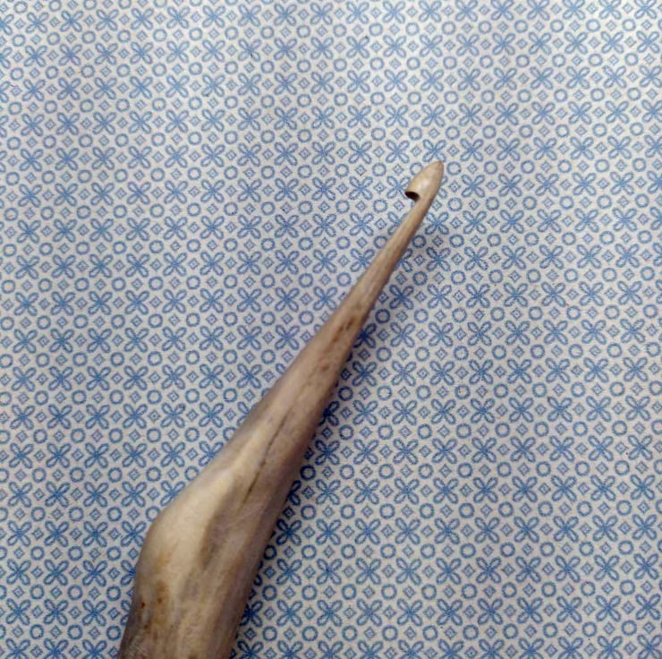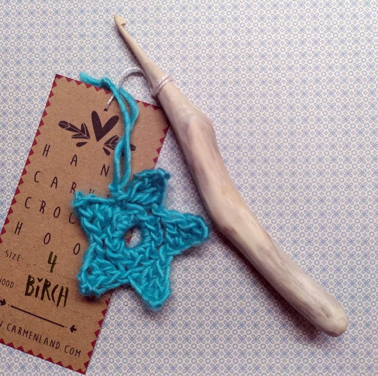 This crochet hook has been hand-carved by me from dry birch wood. Dry wood is sometimes slightly harder to carve, but it's always got the best patterns, so there's a lot of detail in the wood, adding a bonus visual treat!