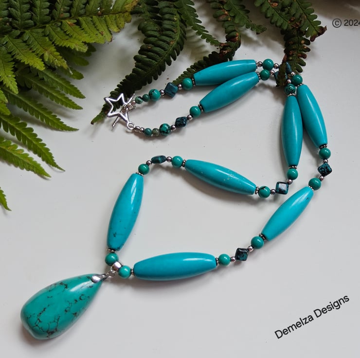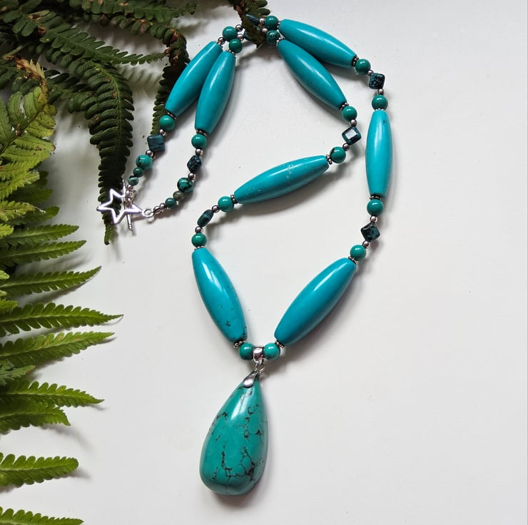 This unique 'one off' eye catching necklace has been designed and hand crafted in Cornwall using a large central, pear cut natural African turquoise bead with a sterling silver bail and long 3.5cm smooth hand cut elongated tubes. To compliment them 5mm rounds and 5mm square cut turquoise beads add more detail to the design. Within the necklace are flat daisy sterling silver wheel beads and 2mm sterling silver beads. Turquoise beads are hand cut and polished by skilled labidorists. Unlike man made beads no two gemstones are the same which adds to their beauty.