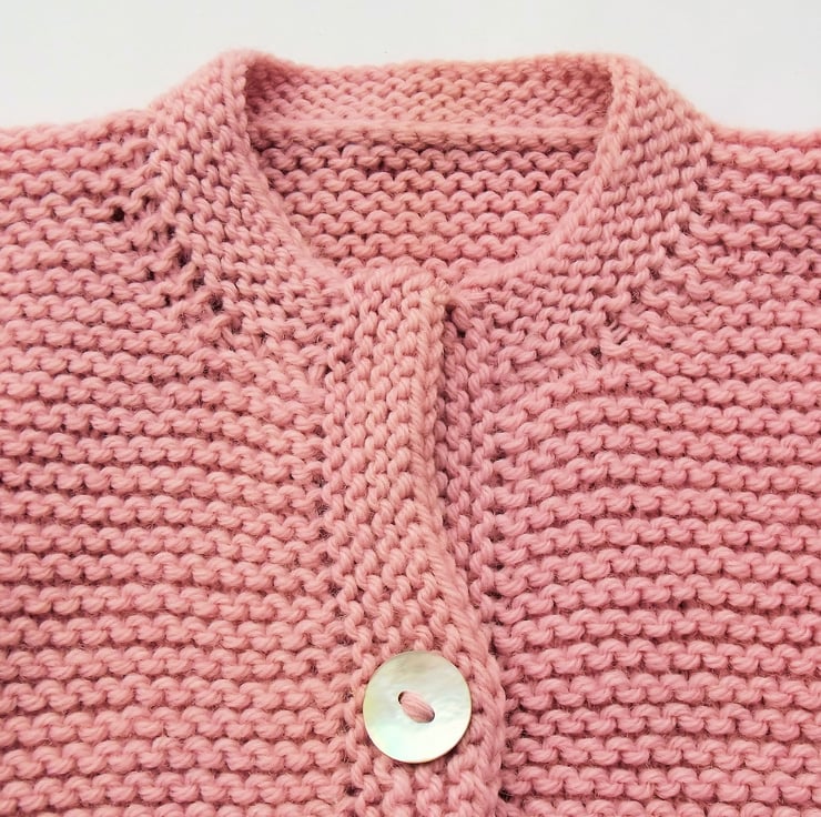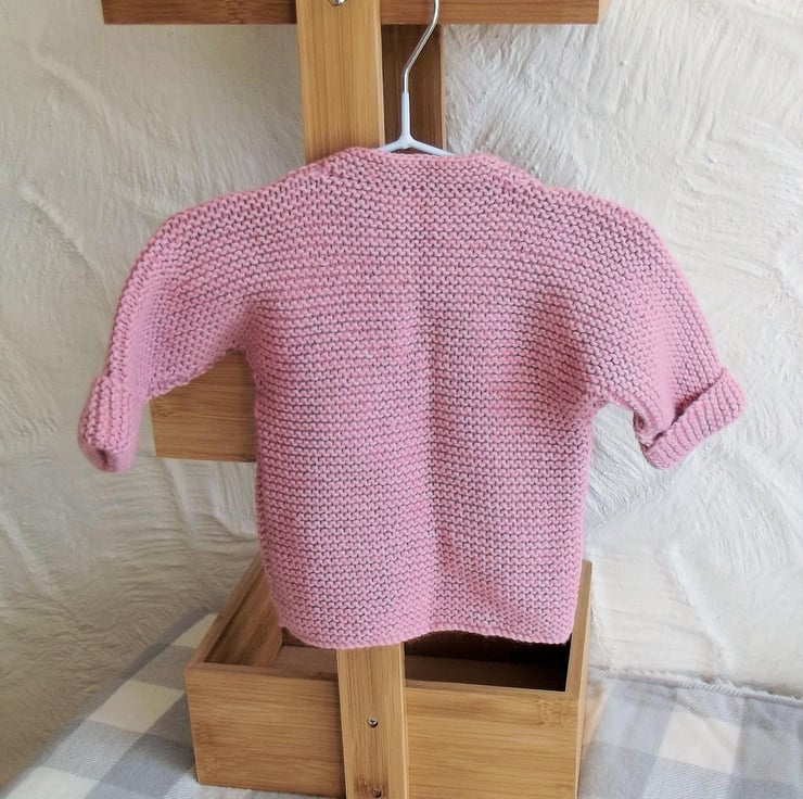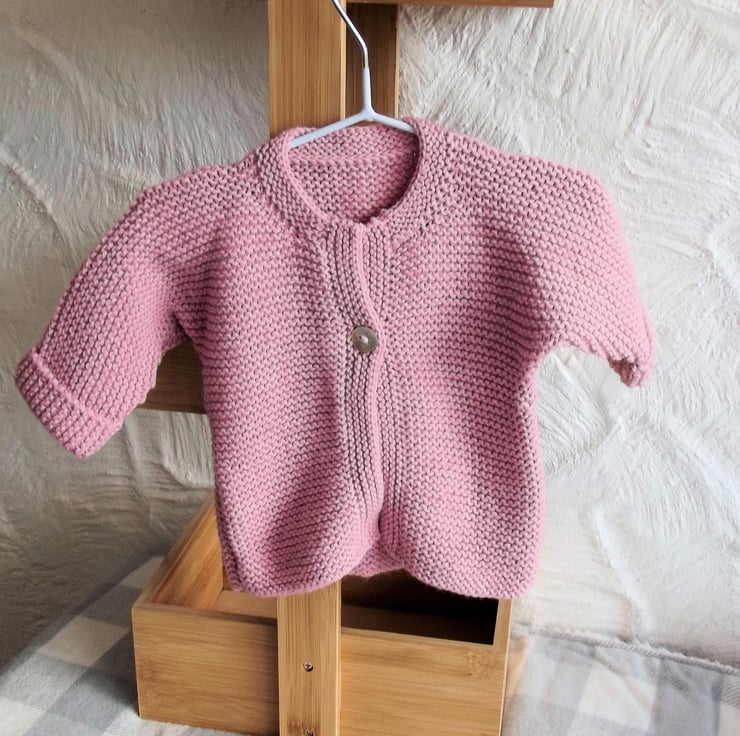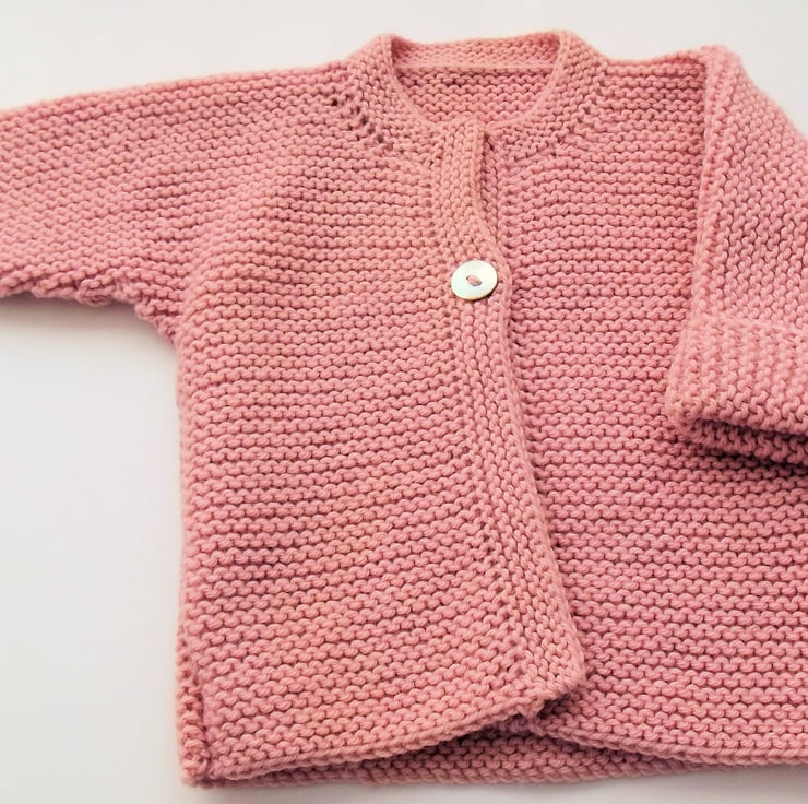 Hand knitted by me. Dusky Pink Babies Cardigan Jacket. Round neck with 1 button closure. Knitted in medium weight acrylic blend yarn. hm36