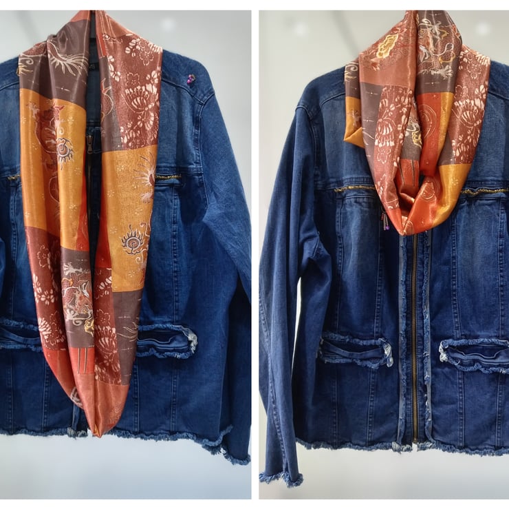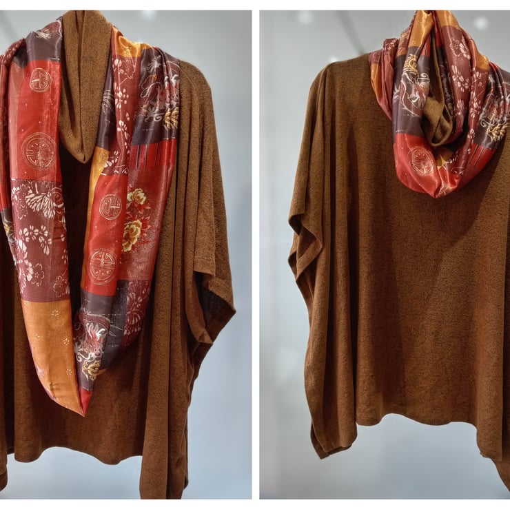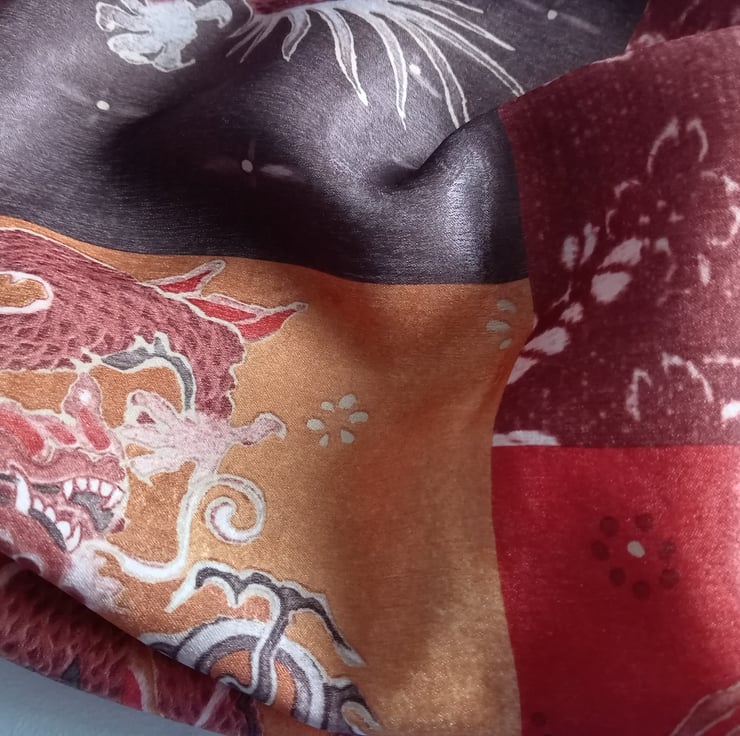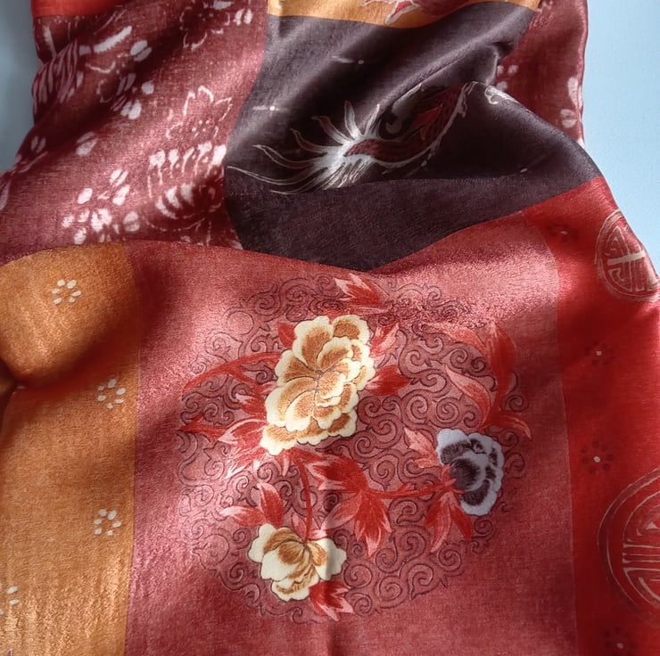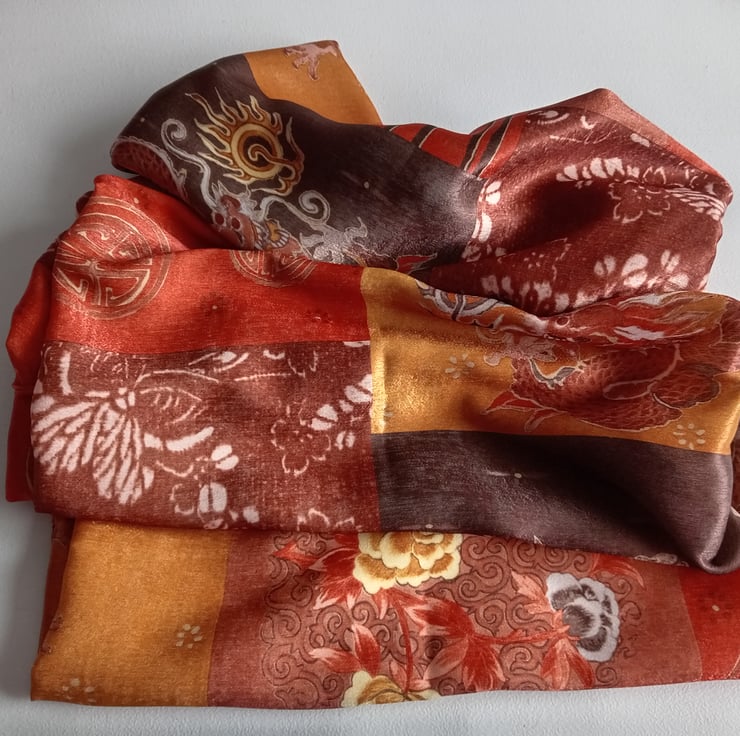 Gorgeous copper, gold and brown colours mixed in this lovely Chinese style satin infinity scarf.