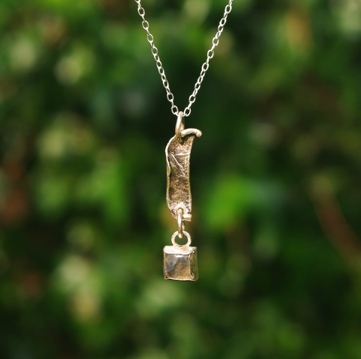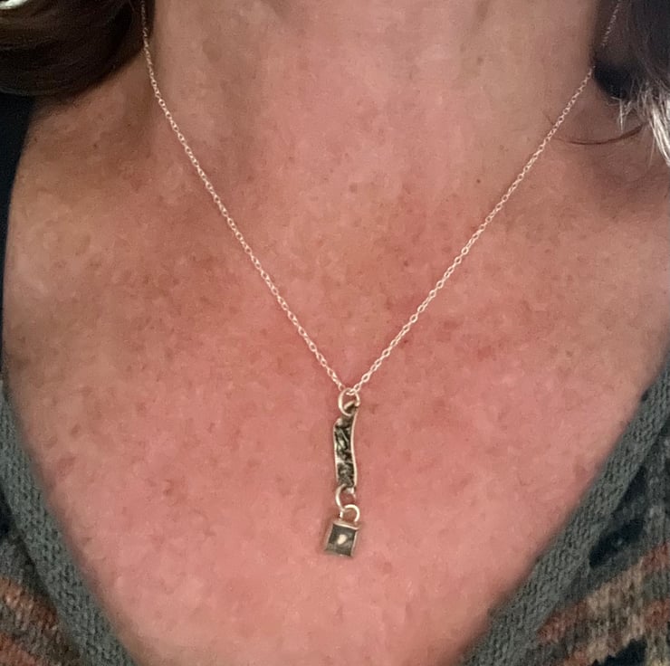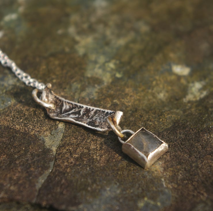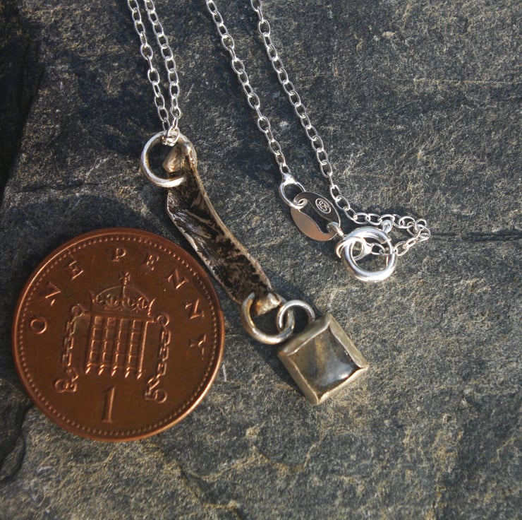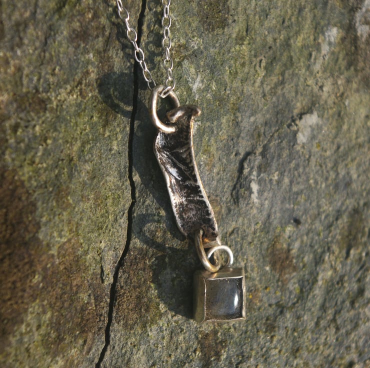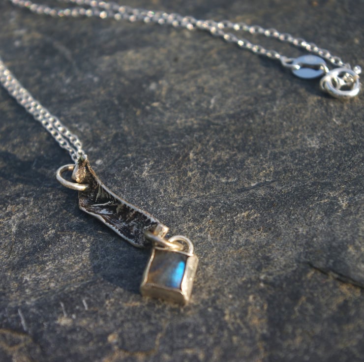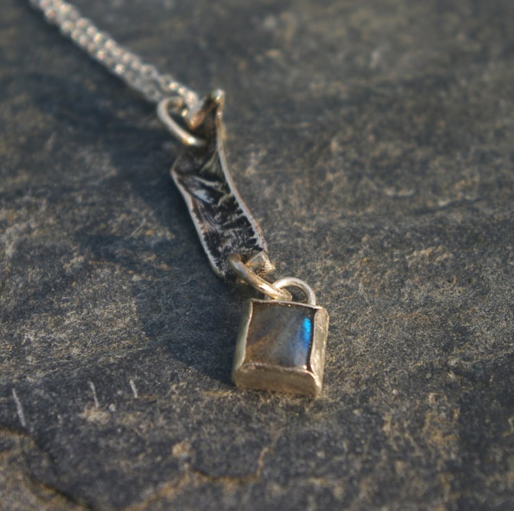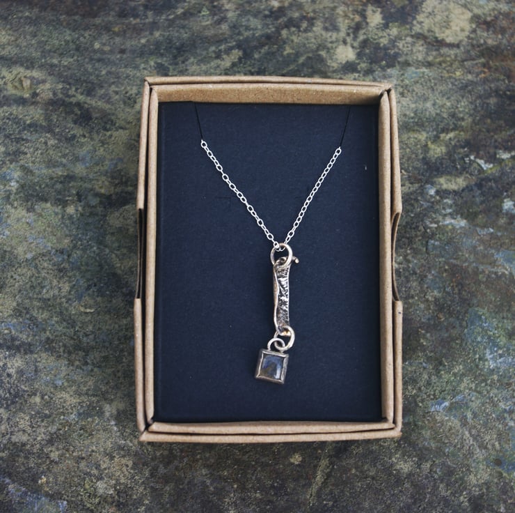 A textured, sterling silver pendant, inspired by organic textures with a Labradorite gemstone. This square cabochon is 6mm square and dangles freely from the bottom. The textured piece is sterling silver made by reticulating the surface of the silver with heat. The Labradorite has some blue iridescence in the light and it is said to stimulate the imagination and calm an overactive mind, developing enthusiasm and new ideas.