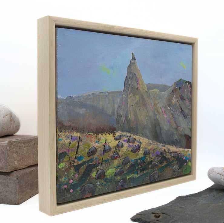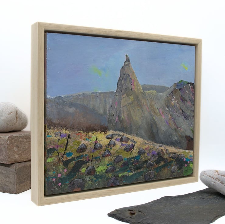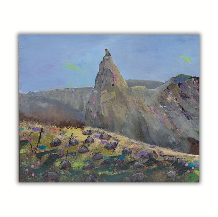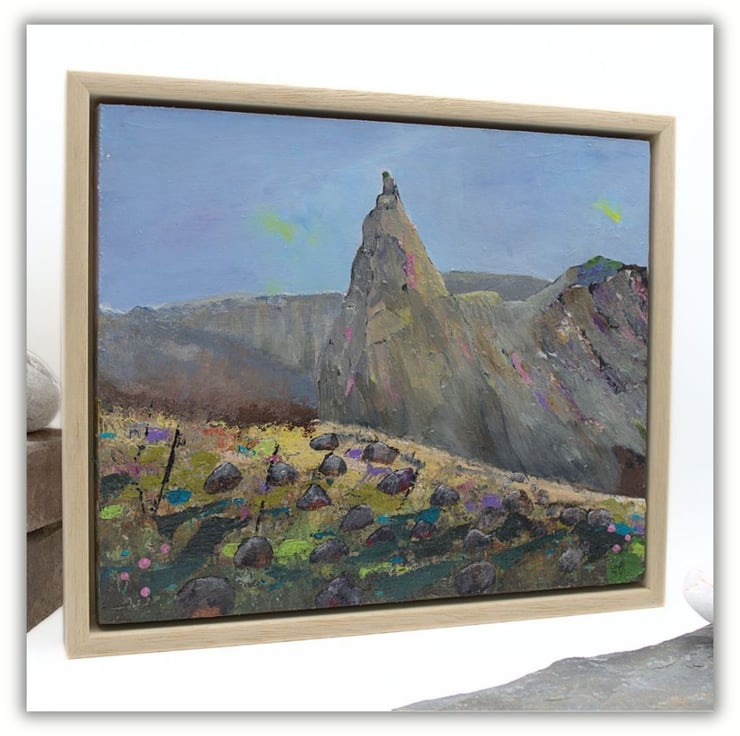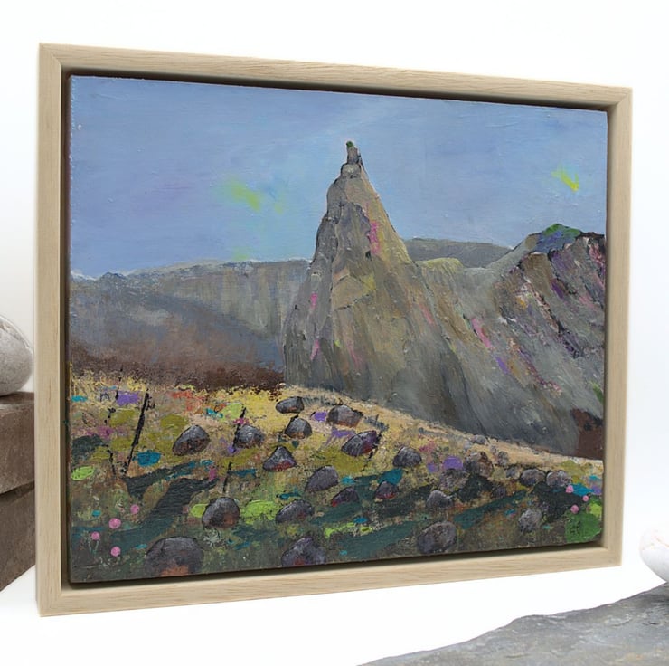 This is an original framed painting of The In Pinn, a Scottish mountain range. It is considered to be the most difficult of the Scottish munros as it involves climbing and scrambling over rock and scree. I've carefully chosen colours to reflect the ruggedness of the beautiful landscape that invites so many visitors to the Cuillin range each year. I've scratched into the paint using old nails and I've used a variety of brushes to create texture and interest.