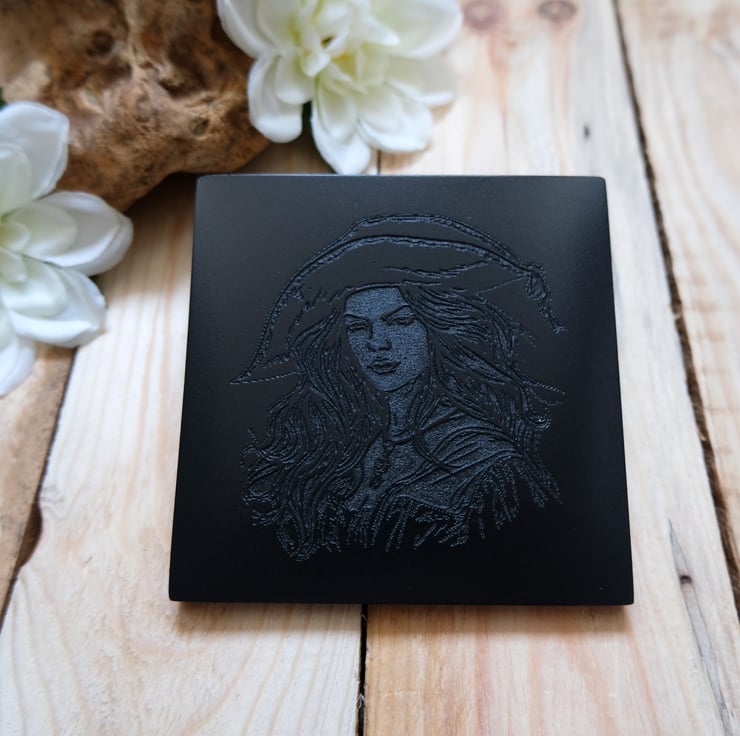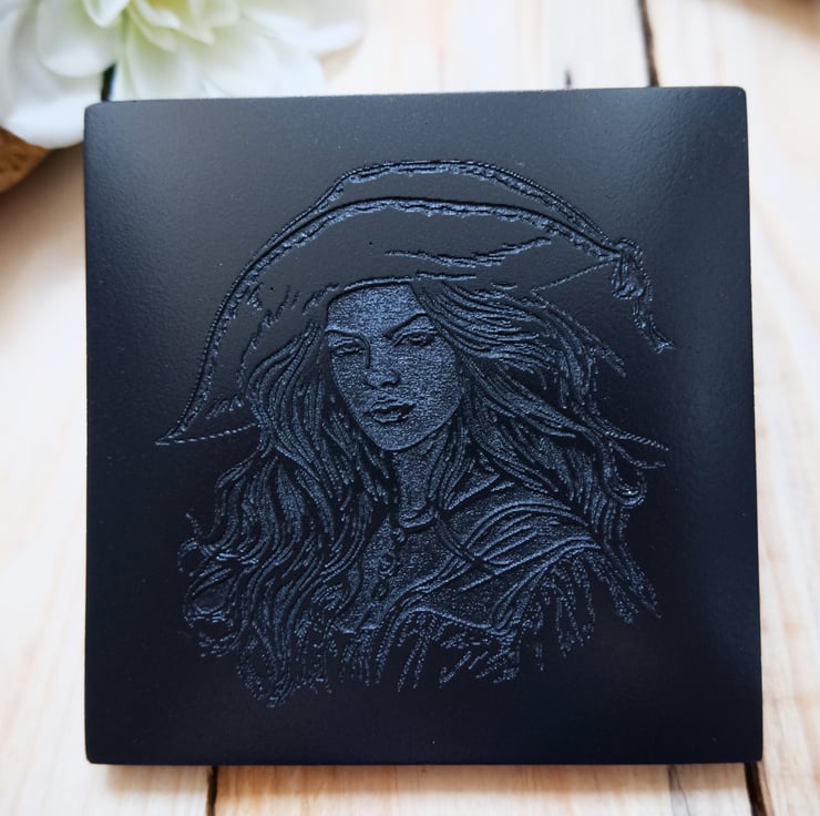 This unique square stonecast coaster features a detailed engraving of a pirate girl, adding a touch of adventure and character to your decor. Crafted with precision, the engraved design showcases the spirit of a daring pirate, making this coaster a bold decorative piece. Its sturdy stonecast construction ensures it will stand the test of time while adding a playful yet artistic vibe to any space.