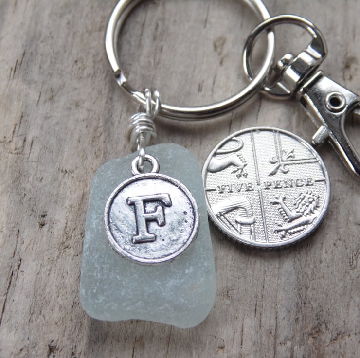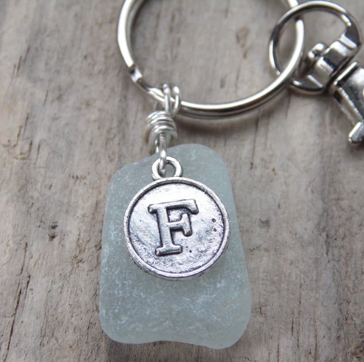 A lovely piece of seafoam sea glass with a silver tone 'F' initial charm, wrapped in silver plated wire, on a silver coloured split ring and clip.