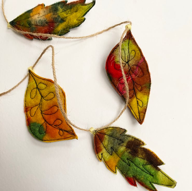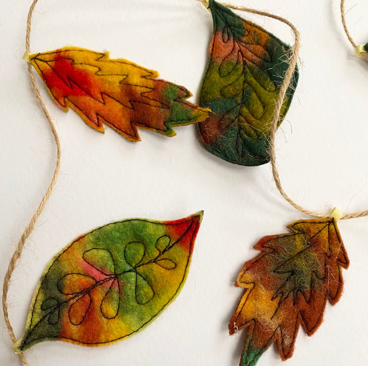 This beautiful autumn leaves garland or bunting is made from pre felt scrap that’s been wet felted and enhanced with free motion embroidery. There are 8 leaves hanging from jute string with up-cycled fabric backing.