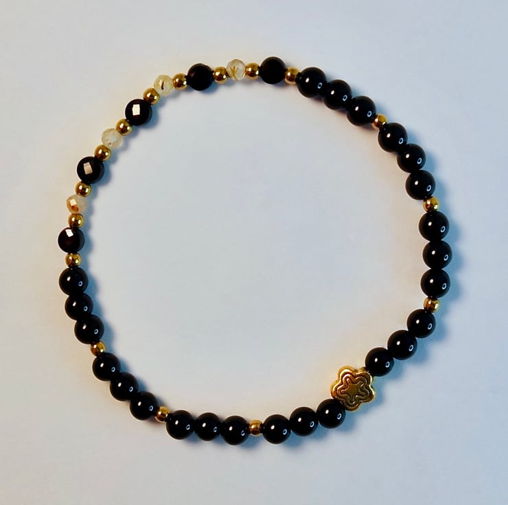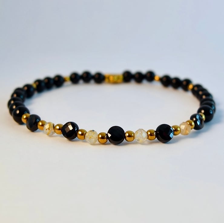Pretty, dainty stretch bracelet featuring a row of five gorgeous, sparkly, faceted AAA grade 4mm Black Spinel coin beads separated by 3mm AAA grade faceted golden Rutilated Quartz and 2mm golden Hematite spacer beads.