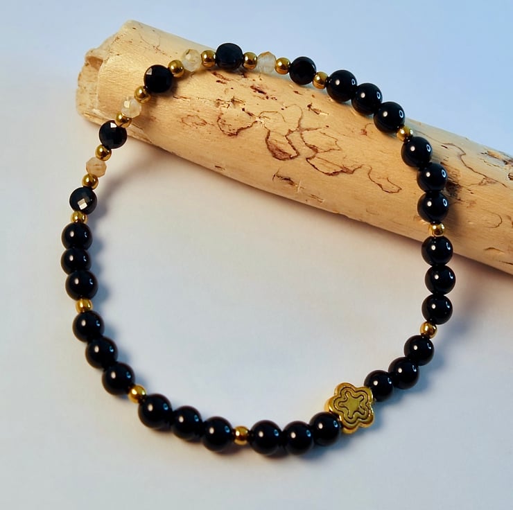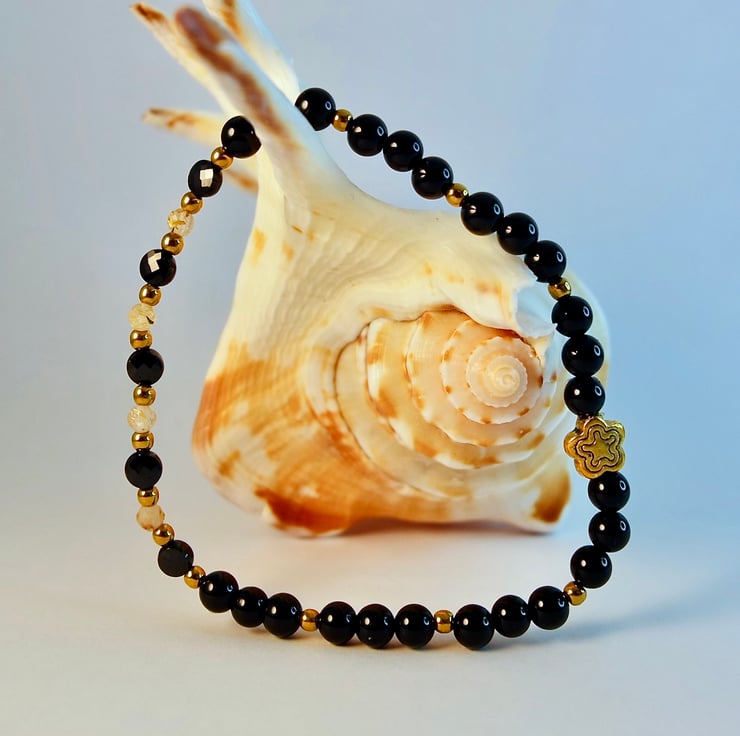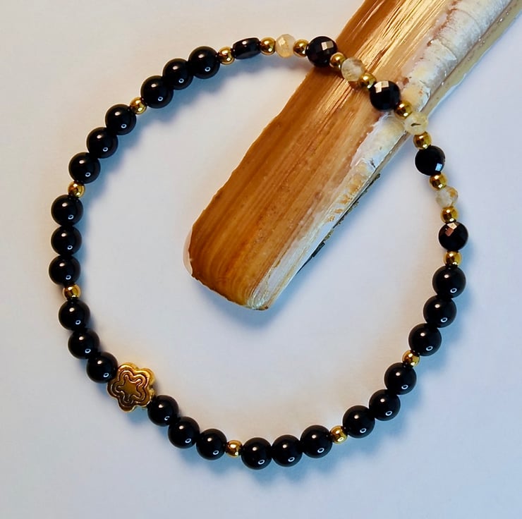 The circle is completed with trios of 4mm Black Onyx separated by 2mm golden hematite, and a 6mm Tibetan style (nickel and lead free) golden flower bead.