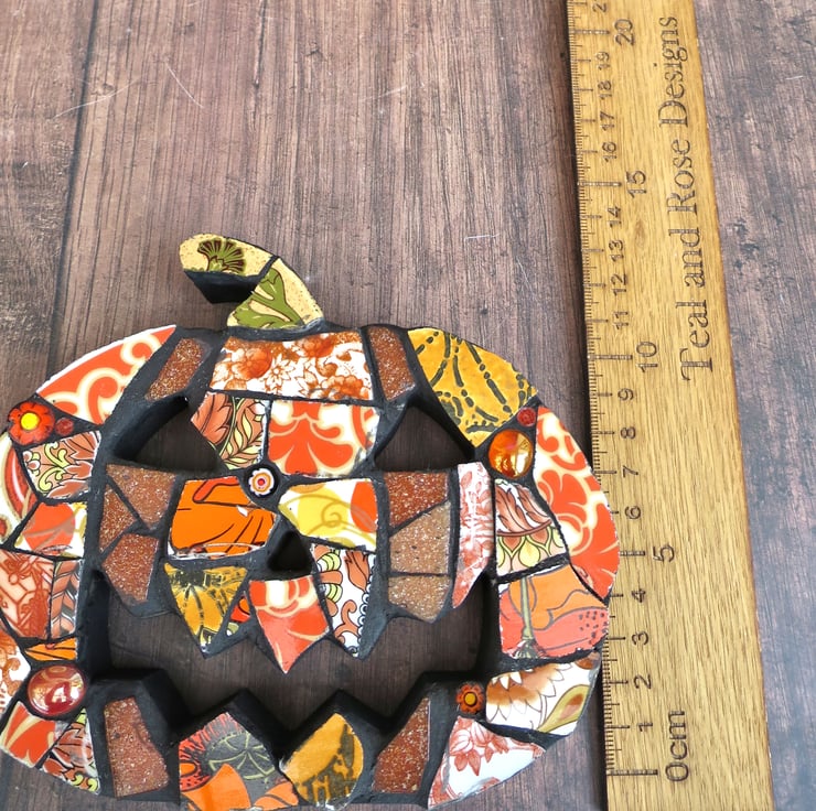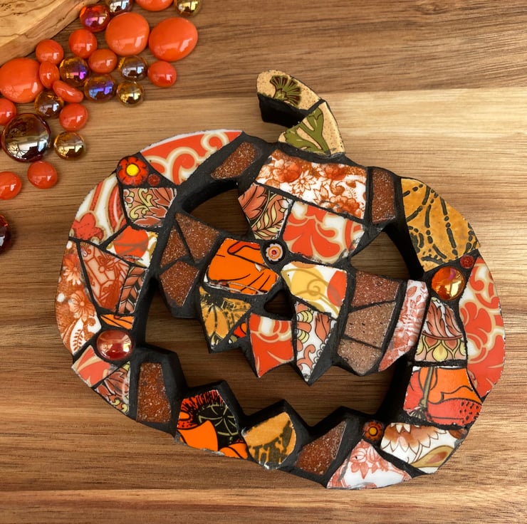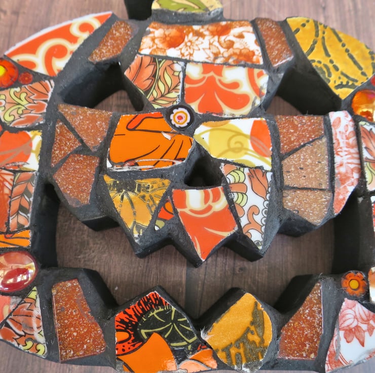 This one-of-a-kind mosaic pumpkin jack o'lantern is handmade using recycled vintage plates – including Royal Doulton Seville – along with vibrant millefiori glass accents. With its autumnal tones and bold patterns, it’s a charming way to add a bit of Halloween fun with an artistic, upcycled feel.