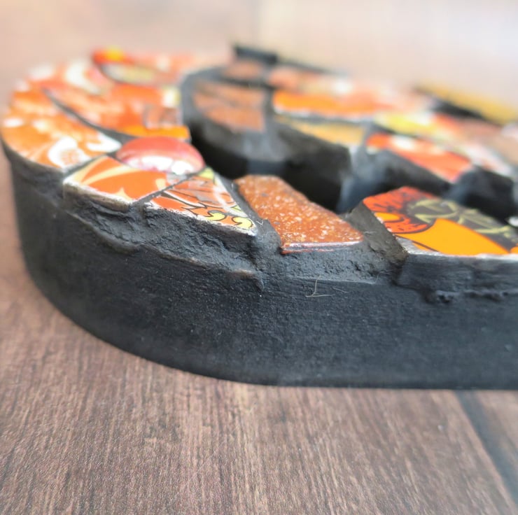 As with all my mosaic pieces, this decoration is made with care from recycled ceramics, so you may spot small marks or subtle signs of wear – part of its unique story and rustic charm. Please handle with care – there may be some sharp edges.