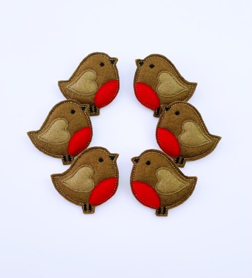 Each Robin is handcrafted from a wool blend felt and a layer of polyester stuffing for padding, then finished with a safety brooch bar securely attached to the back.